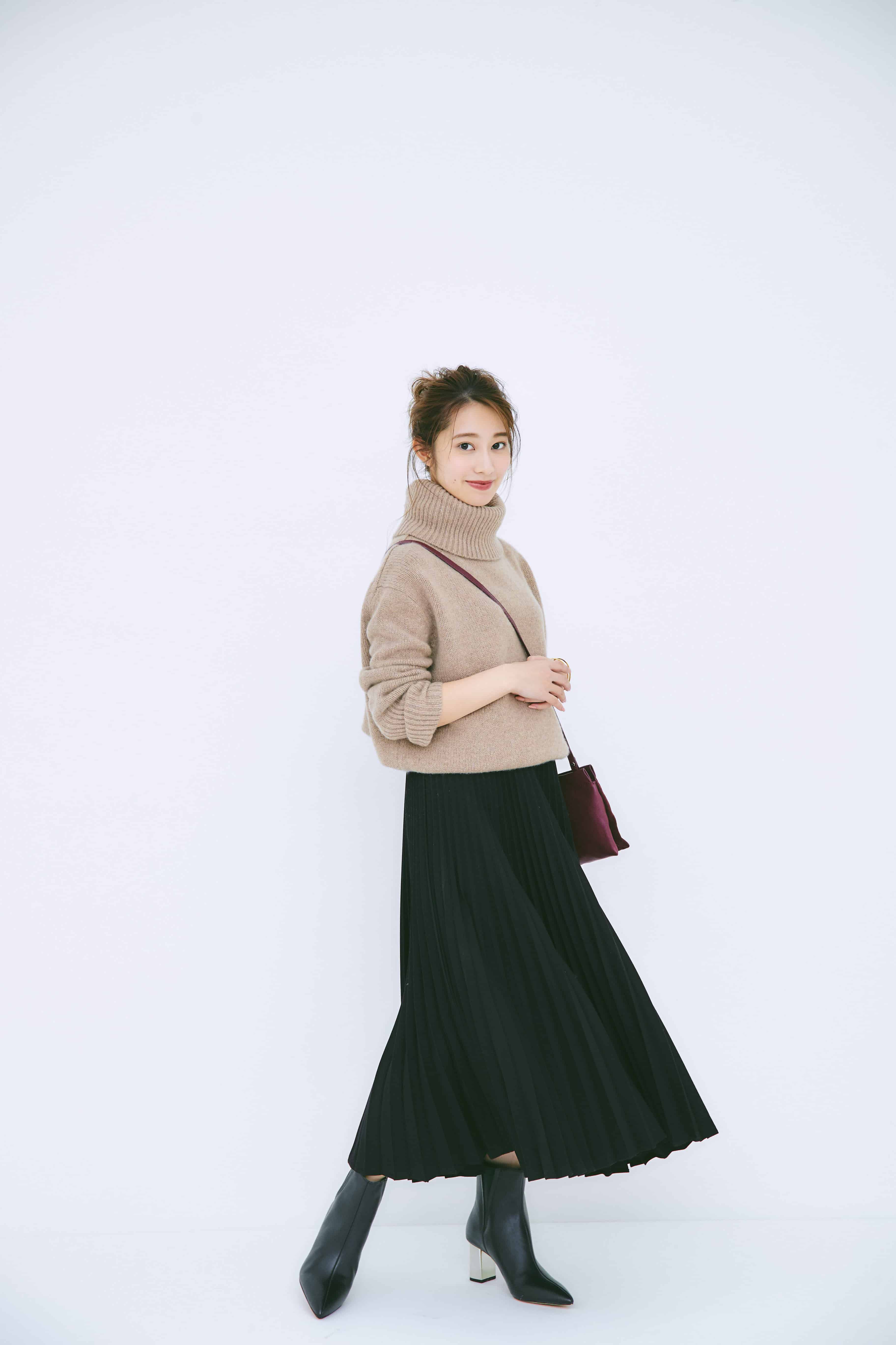 玲香ちゃんの私服でも登場率の高い黒。モード感のある今っぽいスカートコーデに仕上がる黒プリーツスカートはCLASSY.世代のマストハブ。ベーシックカラーではあるけれど、歩くたびにひらっとなびくシルエットで着映えも抜群。ニットをブラウジングして上半身をコンパクトにすれば、フレアスカートもバランスよく着こなせます。