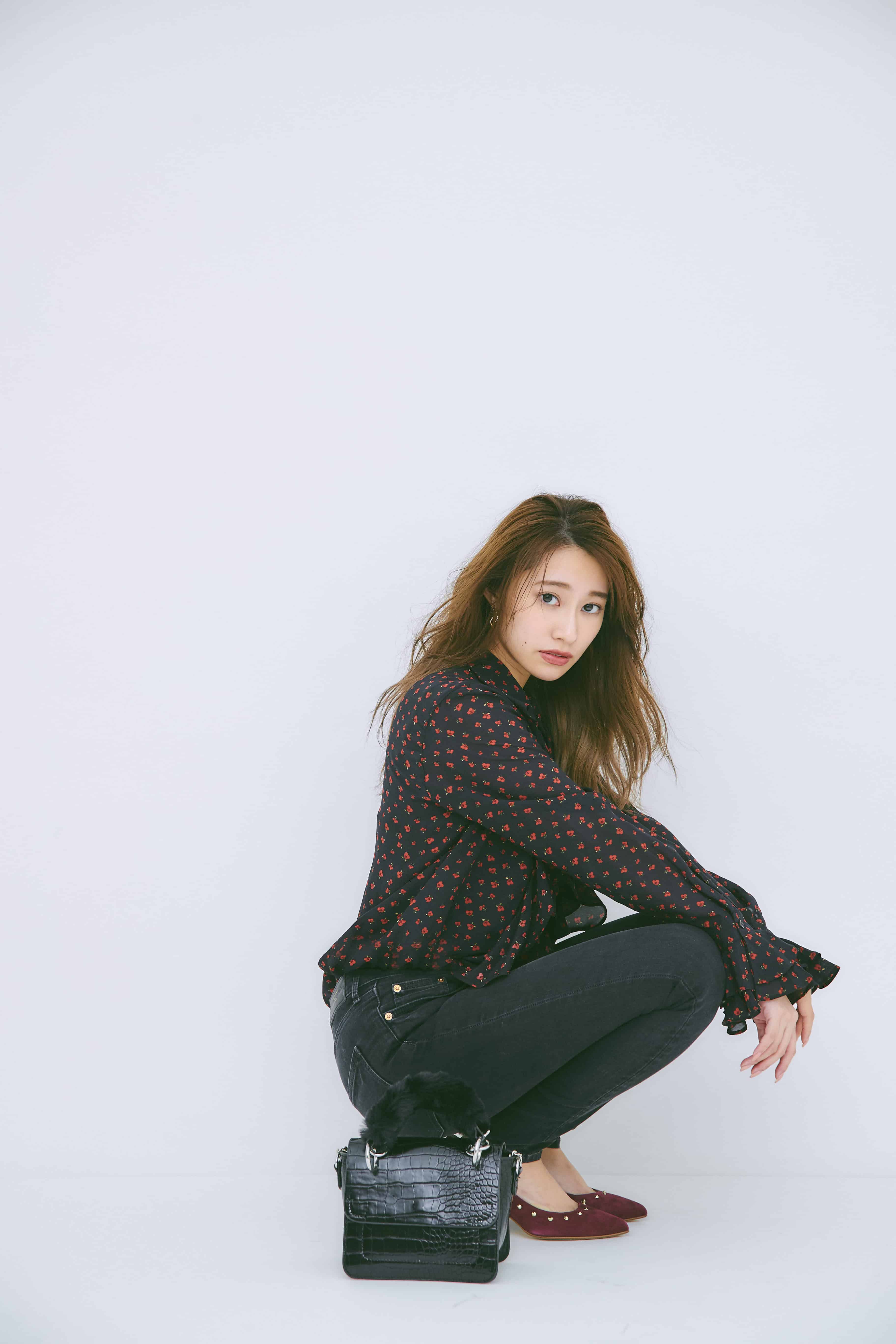 「似合う!」と撮影現場で盛り上がったこのコーデは、玲香ちゃんもお気に入り♡ 小花柄やフロントフリル、フレアスリーブの甘口ブラウスも、ベースが黒だから幼くならなくて安心。ボトムスも黒スキニーを合わせて黒で繋げばカッコいいカジュアルが簡単に完成。柄の色を拾った小物使いで統一感を出すのも、こなれて見せる秘訣。