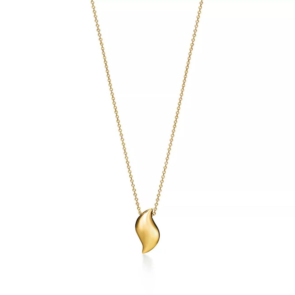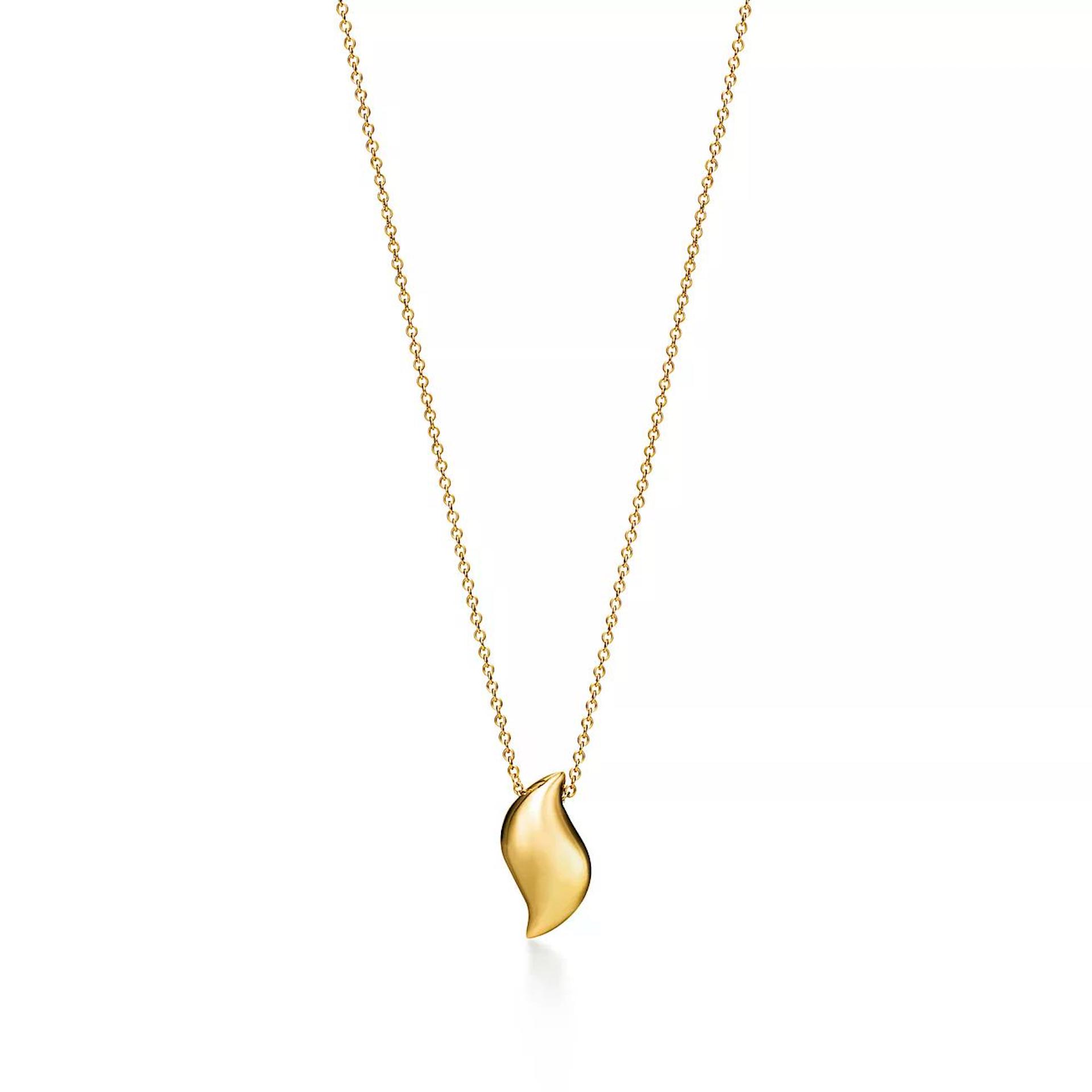 羽を抽象的に解釈したエルサ・ペレッティ™によるデザインのペンダント。硬いゴールドでありながら、フェザーの柔らかさを感じることができるような、美しいシェイプと流麗なフォルムが魅力的。程よいボリューム感のあるトップが胸元に光を集め、ひと際輝くオーラが出現。他のジュエリーとも合わせやすいモダンなジュエリーです。
