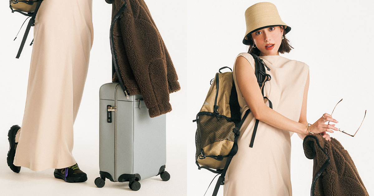 ワンピース¥49,500(SANTÉ by ETRÉTOKYO/エトレトウキョウ)ボアブルゾン¥46,200(ルーニィ)ハット¥44,000(H.at/オートモード平田)ピアス¥39,600リング¥41,800※3点セット バングル¥69,300(すべてブランイリス/ブランイリス トーキョー)バックパック¥30,800(アンドワンダー/アングローバル プレスルーム)キャリーケース¥448,250(ボナベンチュラ)スニーカー¥34,100(VEJA/シードコーポレーション)