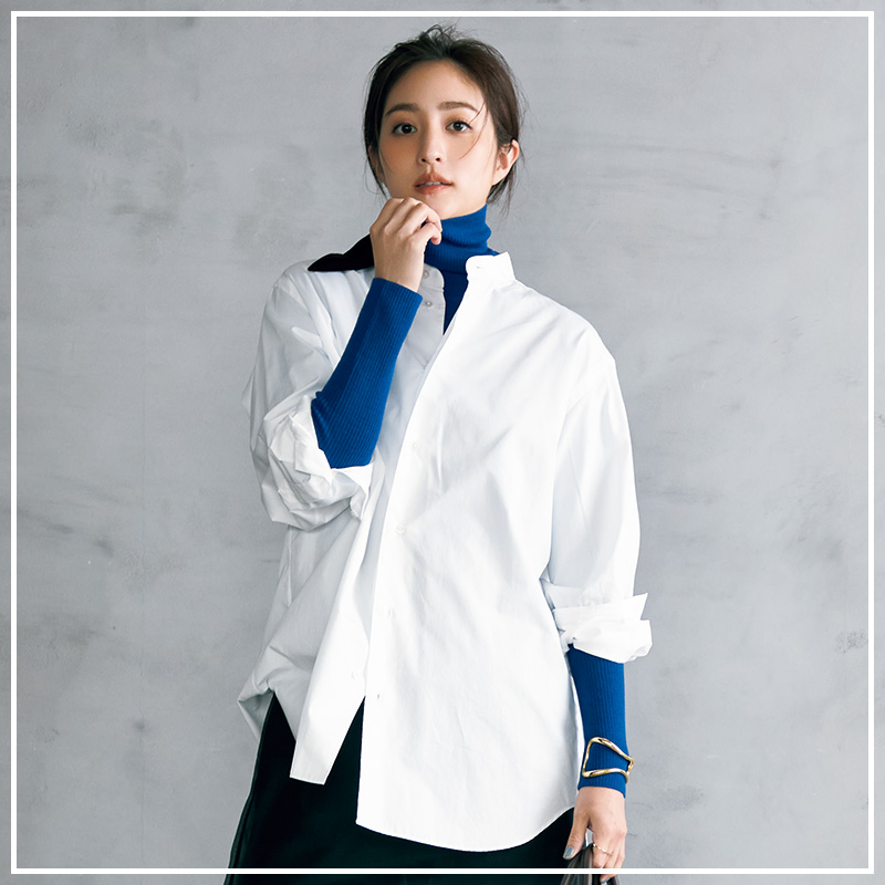 少しゆとりのあるシルエットと軽やかなシアー素材で、冬のレイヤードでもサマになる万能な一着。薄手ながらハリのある質感が上品に映え、エレガントさが引き立ちます。シャツ¥31,900(カオス/カオス丸の内)