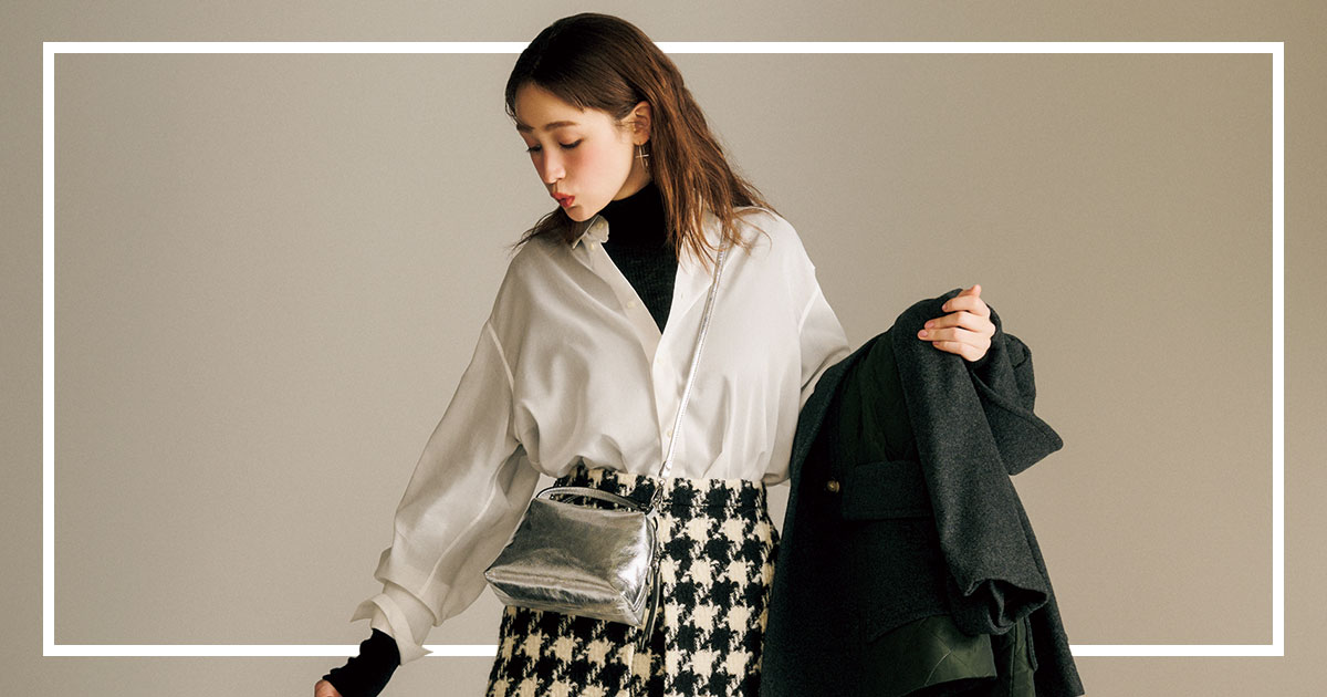 シャツ¥31,900(カオス/カオス丸の内)スカート¥39,600(ルル・ウィルビー/アルアバイル)コート¥68,200(ランバン オン ブルー)タートルニット¥8,990(PLST)ピアス¥193,600(Hirotaka/ヒロタカ 表参道ヒルズ)ショルダーバッグ¥35,200(ジャンニ キアリーニ/ジャンニ キアリーニ 銀座店)バッグ¥19,800チャーム¥12,100(ともにノマディス/ノーベルバ)タイツ¥5,940(マルコモレド)スニーカー¥20,680(pemont /HANA KOREA)