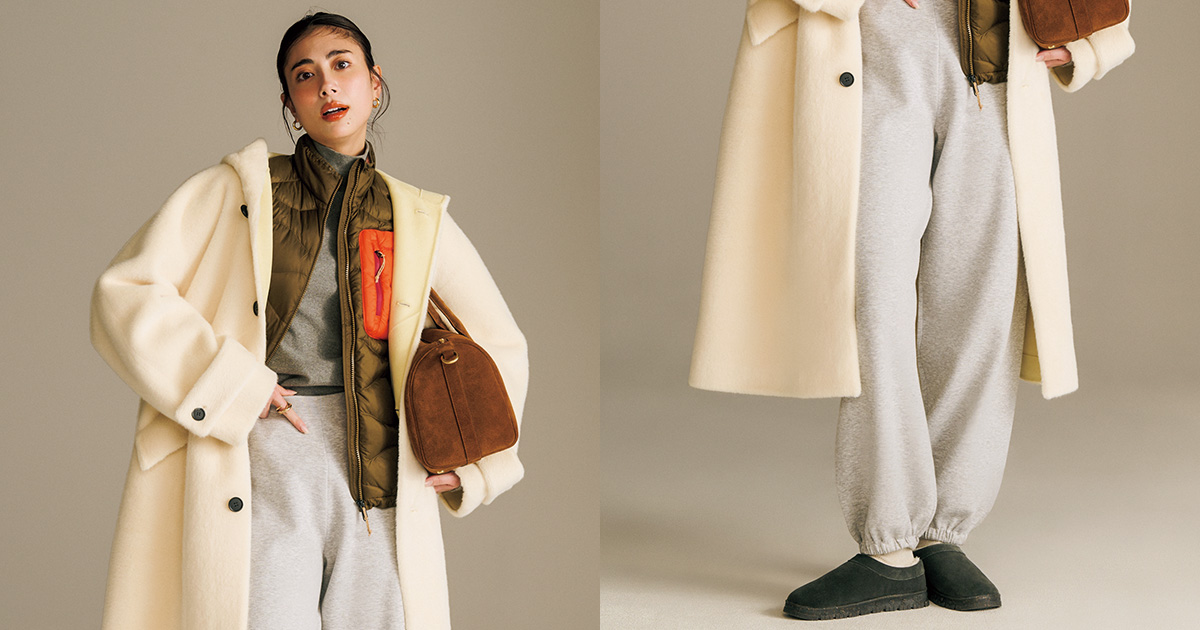ニットパンツ¥31,900(Theory/リンク・セオリー・ジャパン)タートルカットソー¥20,900(SEA/エスストア)ダウンベスト¥31,900(Peak Performance/ピークパフォーマンスコールセンター)コート¥38,500(ミースロエ/ミースロエ ルミネ新宿1店)ピアス¥14,300(ヴァンドームブティック/ヴァンドームブティック 大丸東京店)リング¥59,400(ブランイリス/ブランイリス トーキョー)バッグ¥77,000チャーム¥44,000(ともにコーチ/コーチ・カスタマーサービス・ジャパン)ソックス¥1,120(靴下屋/タビオ)ショートブーツ¥15,400(ミネトンカ/ミネトンカカスタマーセンター)