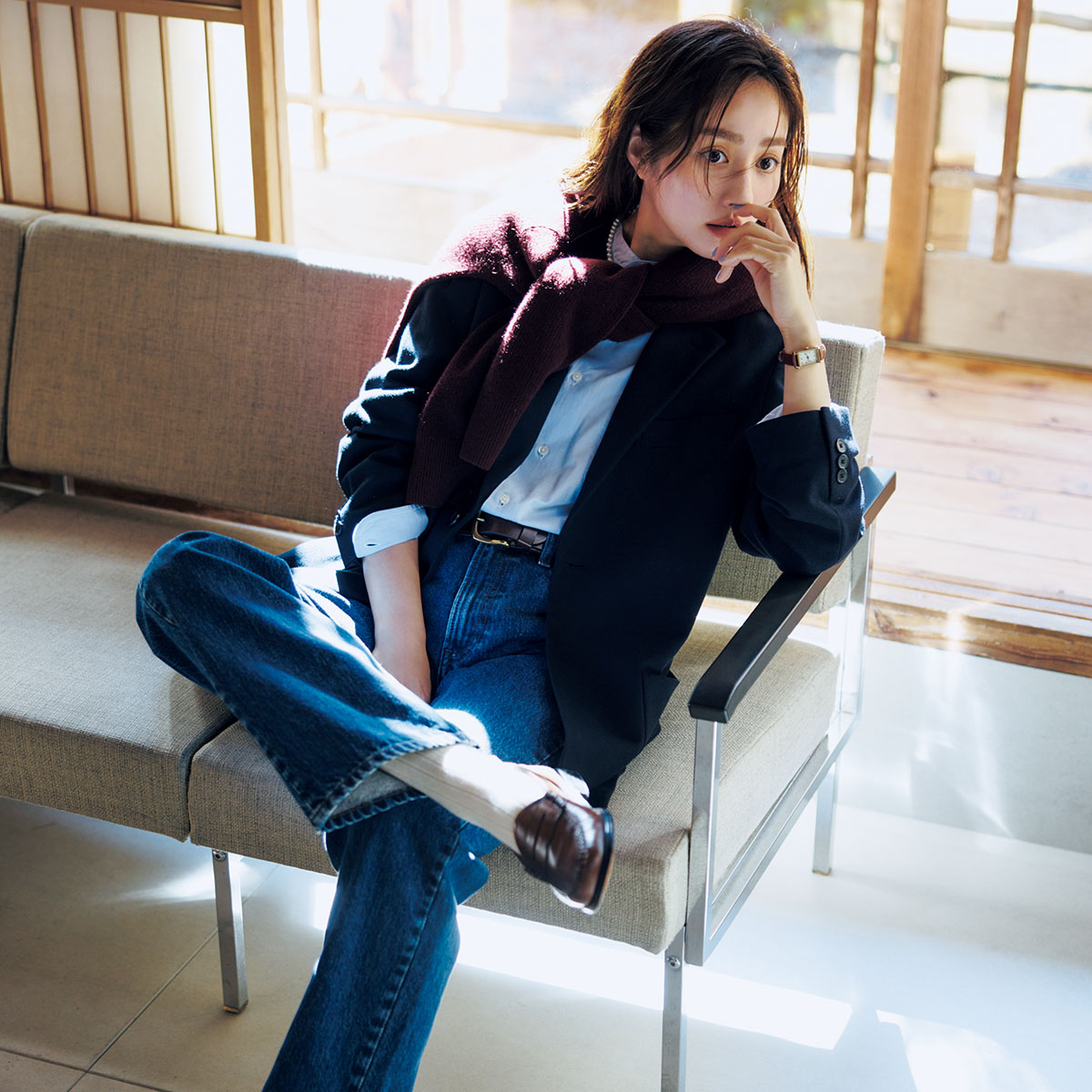 肩の落ち感やゆとりあるシルエットが、いつもの組合せにリラックスムードをプラスしてくれます。デニムパンツ¥4,990〈ユニクロ アンド ジェイ ダブリュー アンダーソン〉ジャケット(メンズ)¥6,990(ともにユニクロ)シャツ¥38,500(インディビジュアライズド シャツ/メイデン・カンパニー)肩に掛けたニット¥12,900ソックス¥1,990(ともにムジラボ/無印良品 代官山)ネックレス¥27,500(モニス/フォーティーンショールーム)時計¥20,900(マトウ/エイチエムエスウォッチストア 表参道)ベルト¥15,400(トリー レザー/メイデン・カンパニー)ローファー¥34,100(ジーエイチバス/ジーエイチバス トウキョウ)