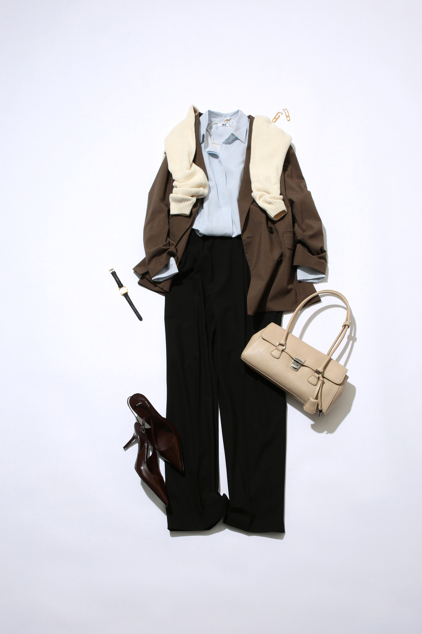 ストライプシャツやジャケットなど、きちんと見えアイテムを軸にしつつ、ゆるふわセーターの肩掛けで抜け感を出して。リラクシーなアイテムを一点投入すると、こなれた通勤コーデが完成します。小物は服の色味に合わせると統一感が出て◎。タックワイドパンツやセーターもユニクロのもので、¥4,000以下で手に入ります!