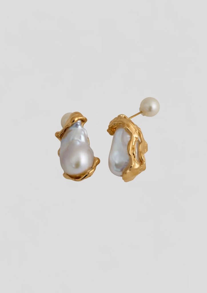 ワックスでバロックパールを包み込むように形成した唯一無二のデザイン。肌に自然に馴染みながら、角度によって異なる表情を楽しめます。通常キャッチのほかにパールキャッチ付きで、前後を入れ替えても使えるマルチウェイ。完全受注生産、手作りの1点ものピアスで自分だけの輝きを手に入れて。印象的な輝きでホテル婚やナイトウェディングにおすすめです。