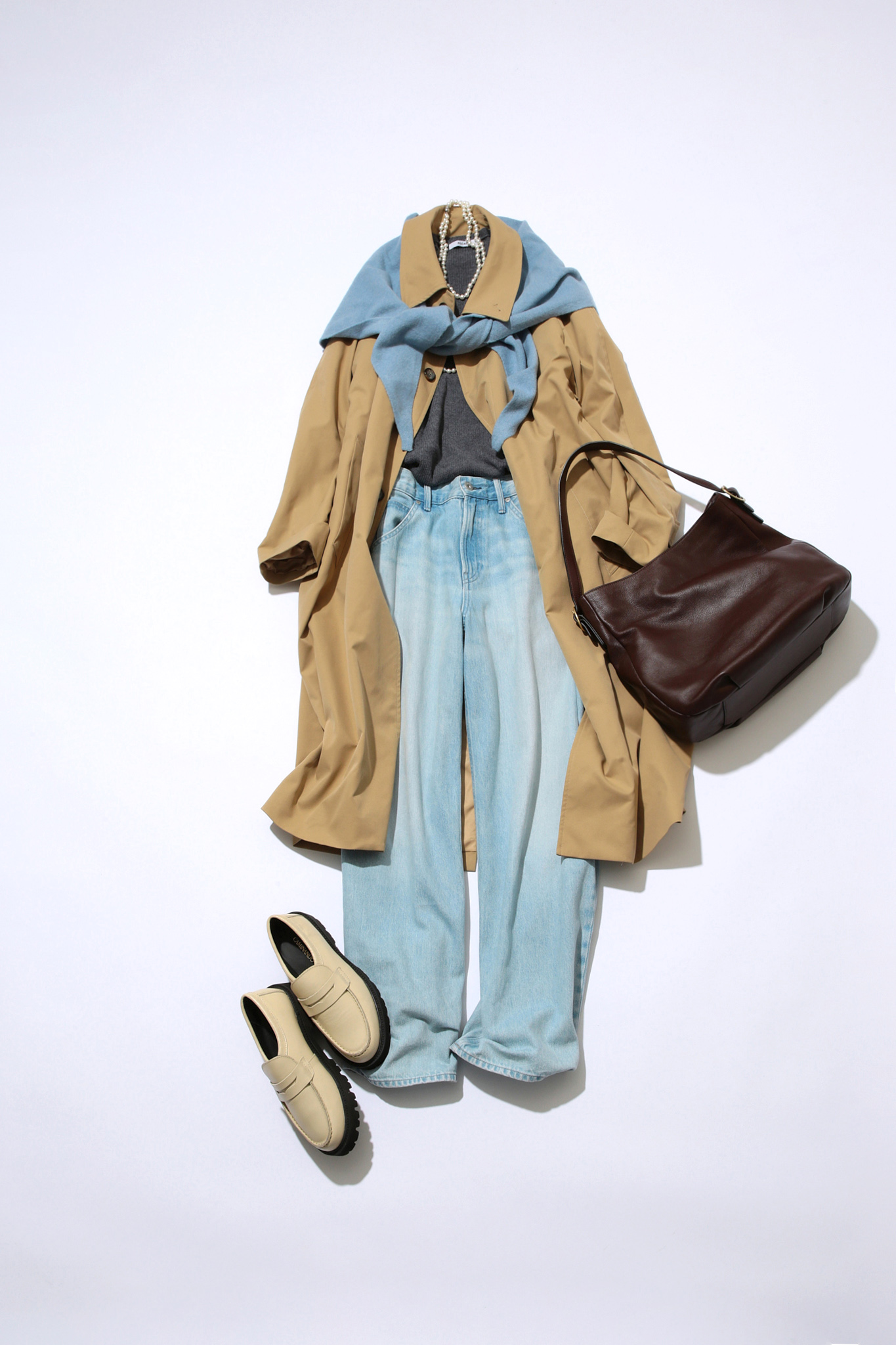 デニム×丈の長いコートは、コーデが重たく見えてしまうことも。明るいブルーとベージュの組み合わせにより、軽やかにまとまります。アウターやバッグの艶感が、カジュアルさを軽減し、キレイめさを演出。首元には、デニムと色味をリンクさせたブルーのストールを効かせて、洒落感アップ。