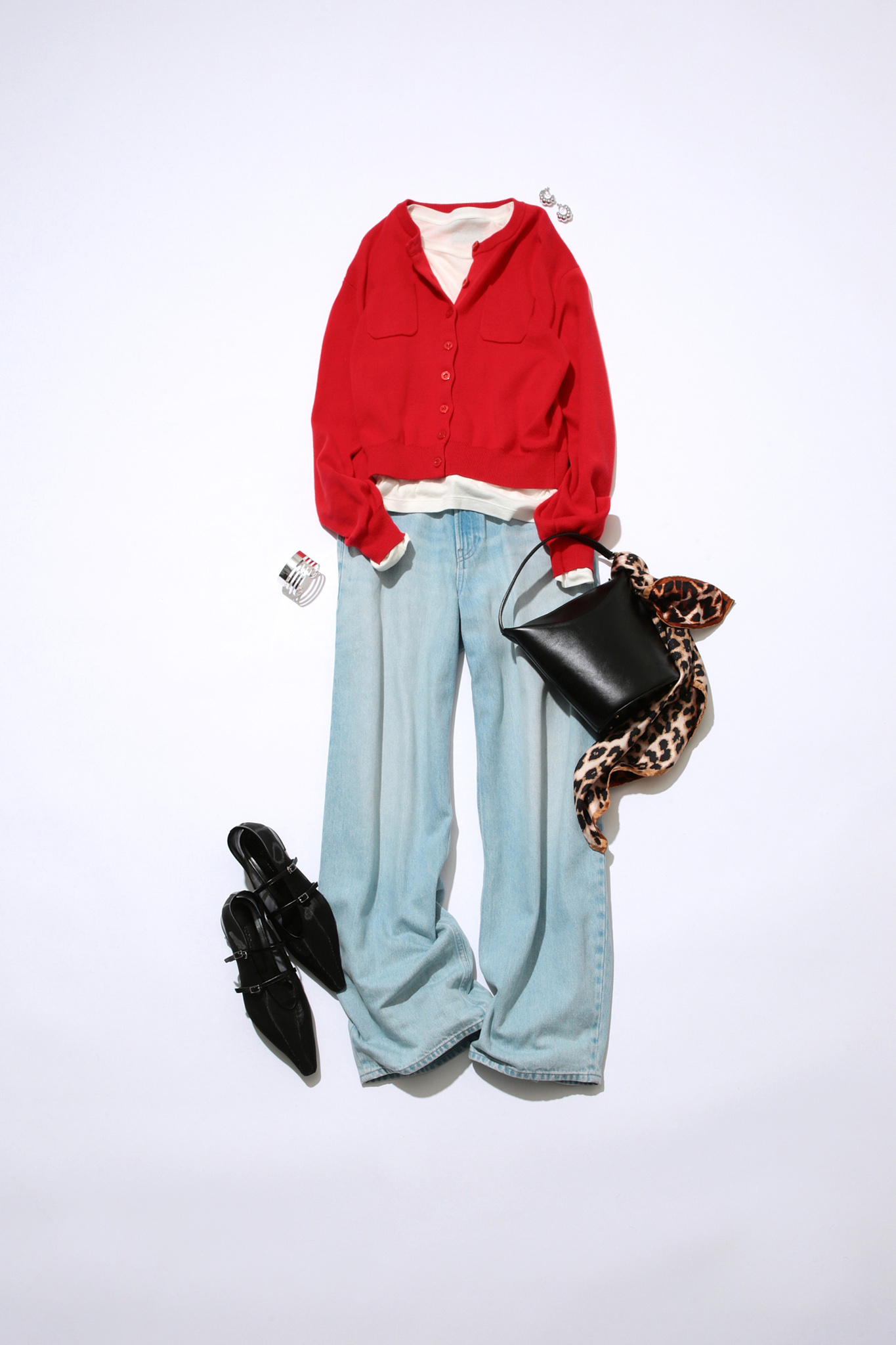 コーデにさりげなくトレンド感を取り入れたい日は、今季注目の“赤”をデニムで受け止めるのが正解。ゆるっとしたシルエットのデニムを合わせれば、こなれ感が出て、主役級に目立つ赤トップスにも挑戦しやすいはず!インナーやアクセサリーは、白やシルバーを選んでフレンチっぽいスタイルに仕上げて。