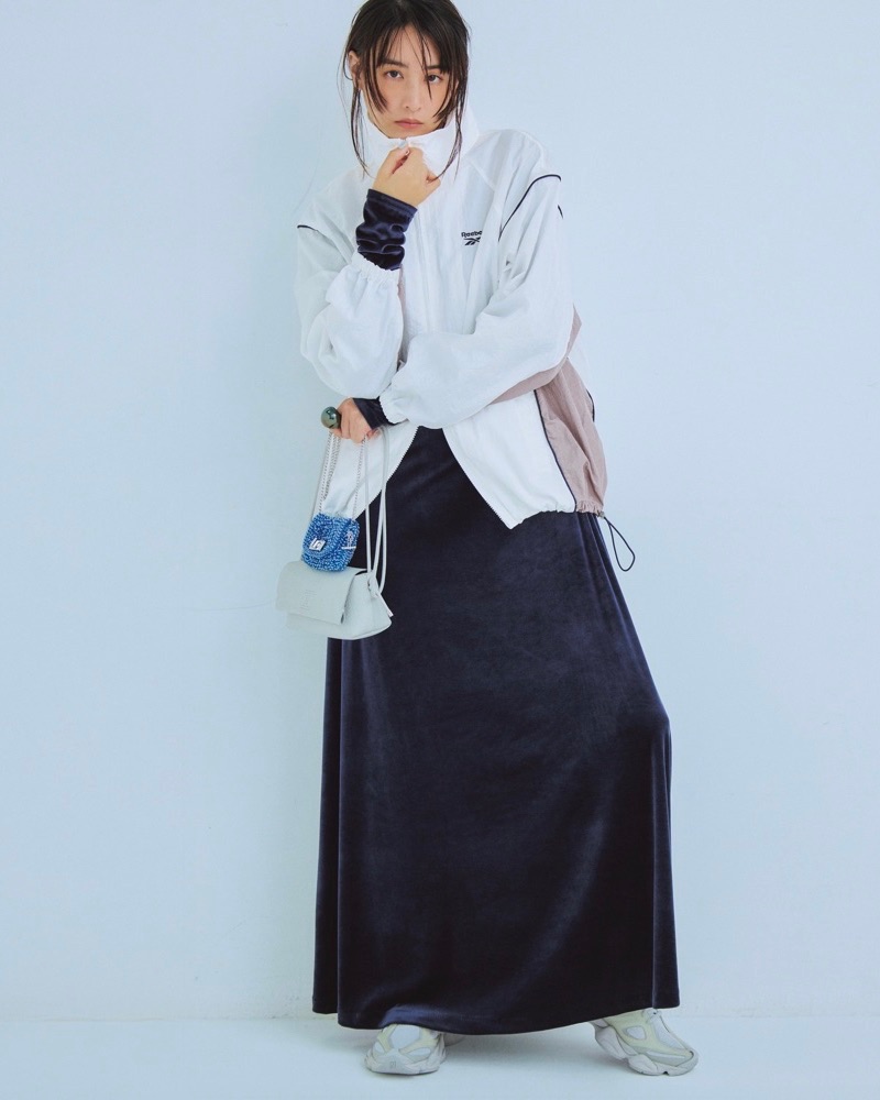 1月31日(土)、スポーティーなナイロンブルゾンが主役のスタイル。スポーツMIX初心者なら、シアーホワイトを選ぶだけで洗練度がぐっと上がり、都会的な印象に。ドレッシーなワンピースやスカートなど、コンサバ感のあるアイテムとも好相性なんです。ボトムスはあえてベロアスカートを合わせ、軽やかなトップス×重厚な素材のコントラストで、こなれたバランスに仕上げて。