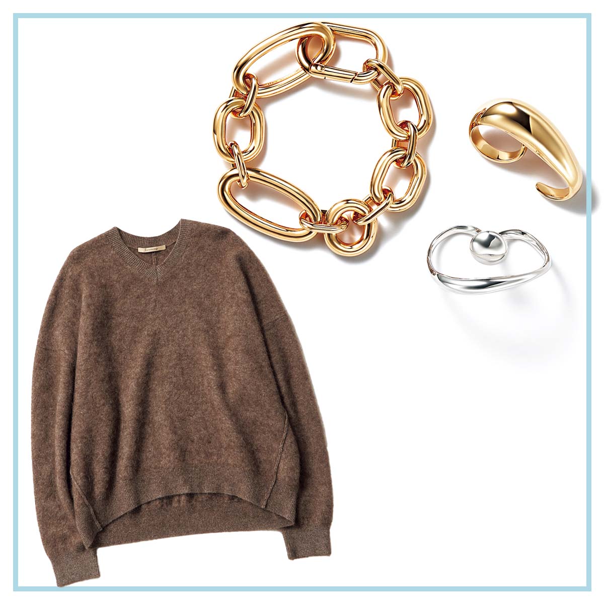 地金の色を合わせない不揃いな輝きで抜け感を