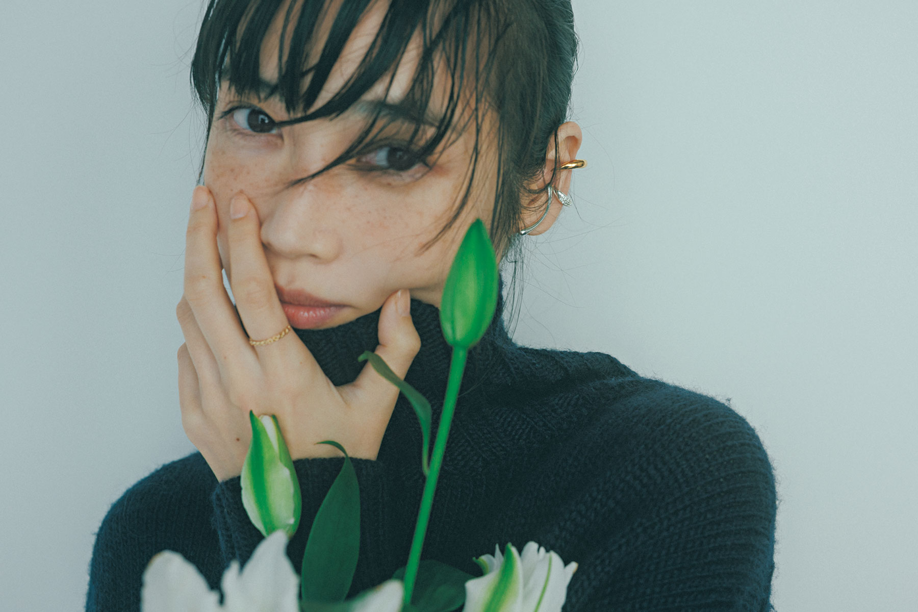 コージーな雰囲気のざっくりハイネックこそ、エッジィなイヤカフの意外性を。ネイビーの親しみやすさに、シャープさをひとさじ加えたバランスが新鮮。イヤカフ上〈SV×YGコーティング×キュービックジルコニア〉¥30,800(ヴァーミリオン)リング〈YG〉¥22,000(ヴイエー ヴァンドーム青山/ヴイエー ヴァンドーム青山 有楽町マルイ店)イヤカフ下〈SV〉¥7,700(ジュエッテ)ニット¥23,100(HER.)