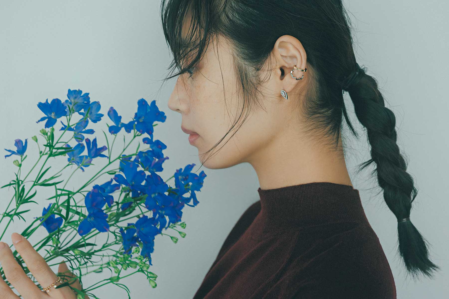 冬の定番だけに無難に見えやすいハイネックは、イヤカフやピアスを自由に重ねた“耳元のレイヤード”で、さりげなく個性をプラスしたい。首元が隠れる分自然と顔まわりへ視線が集まり、ジュエリーの存在感がより際立つのもこのバランスならではの楽しみ♡