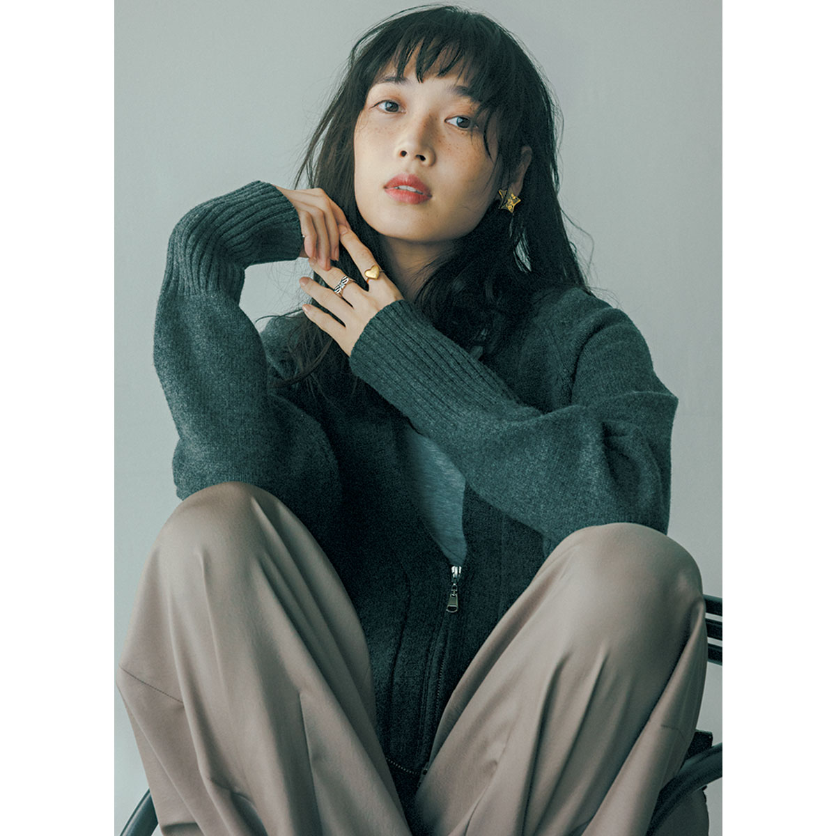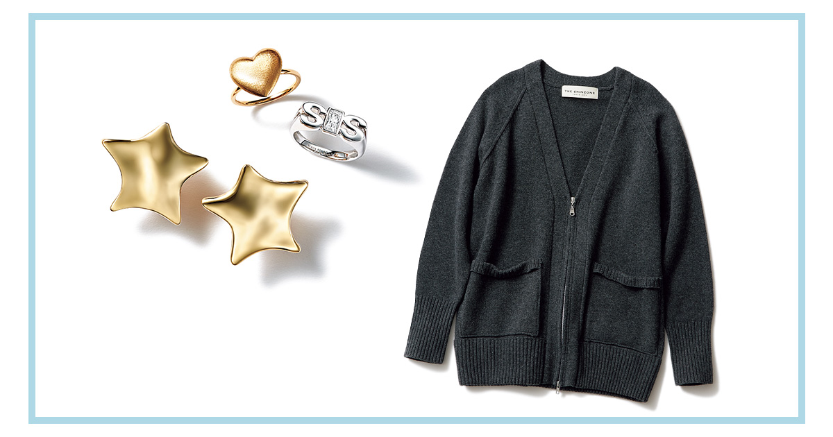 トラックスーツのように気負わず着られるスポーティニットには、大ぶりのモチーフで手抜き感を一掃。“おしゃれを楽しんでる”テンションの高さが、意図したラフさに変えてくれる。イヤリング¥14,300(イリスフォーセブン/フーブス)左手人さし指リング〈SV×YGコーティング〉¥35,200(マリハ)左手中指リング〈SV×ホワイトジルコニア〉¥24,200(マリア ブラック/マリア ブラック 表参道店)中に着たTシャツ¥16,500(シー/エスストア)カーディガン¥42,900(ザ シンゾーン/シンゾーン ルミネ新宿店)パンツ¥39,600(ソブ/フィルム)
