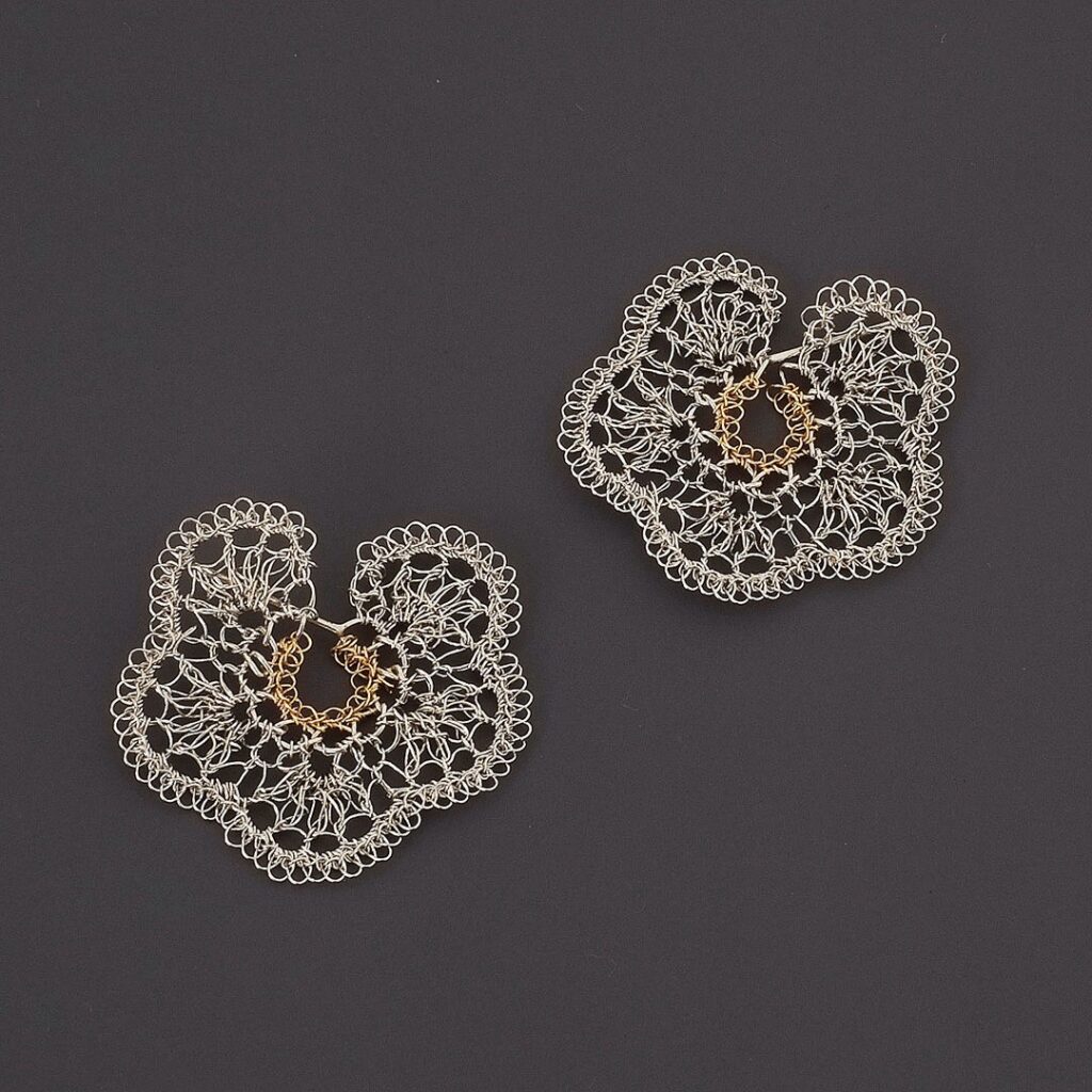繊細で遊び心のあるハンカチが人気の近沢レース店が取り扱うTakahashi Naomiのハンドメイドピアス。かぎ針のマツ編みを金属バージョンに落とし込み、デザイナーによって細心の注意を払いながら編み上げられています。思わず見入ってしまう繊細な金属の編み目は、光の反射によって異なる表情を見せてくれます。自然光の入る明るい会場で身につければ、テーブルや壁に映る美しい松模様の影も楽しめます。近沢レース店、Takahashi Naomi、両ブランドサイトで受注受付中。
