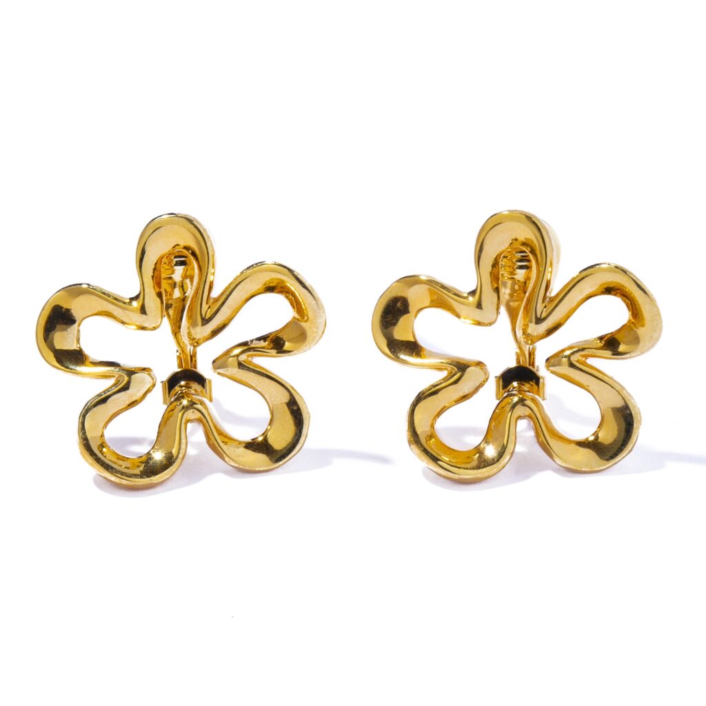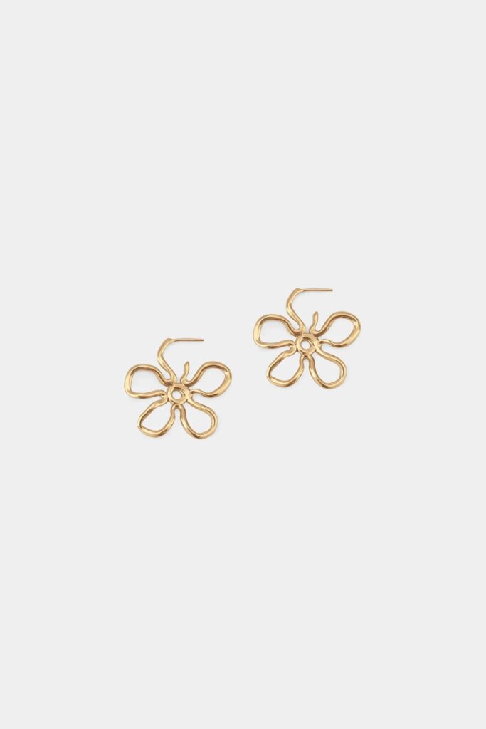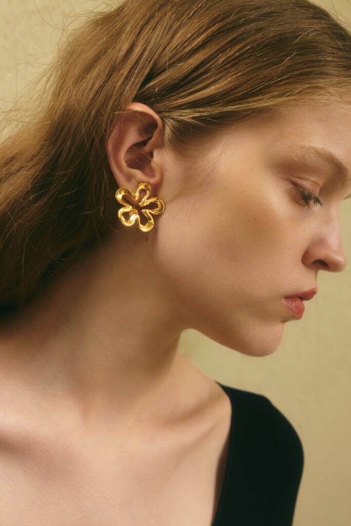 70年代のヴィンテージムードを彷彿とさせるフラワー型フープピアス。花びらが耳を跨ぐようなユニークなデザインで、クラシックなフープピアスにモダンで女性らしいアレンジが施されています。どんなシーンにも映えるこのアクセサリーは、お呼ばれだけでなくデイリー使いにもぴったり。