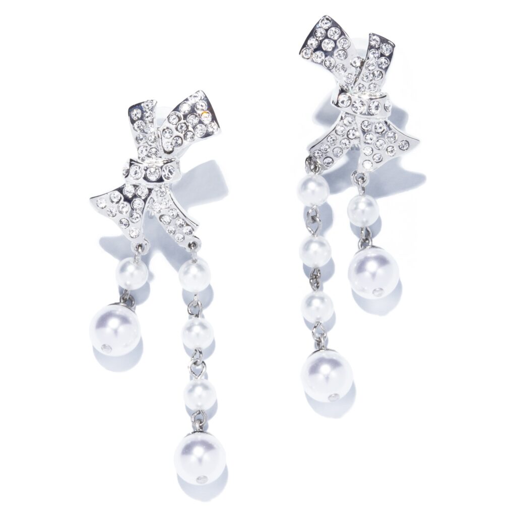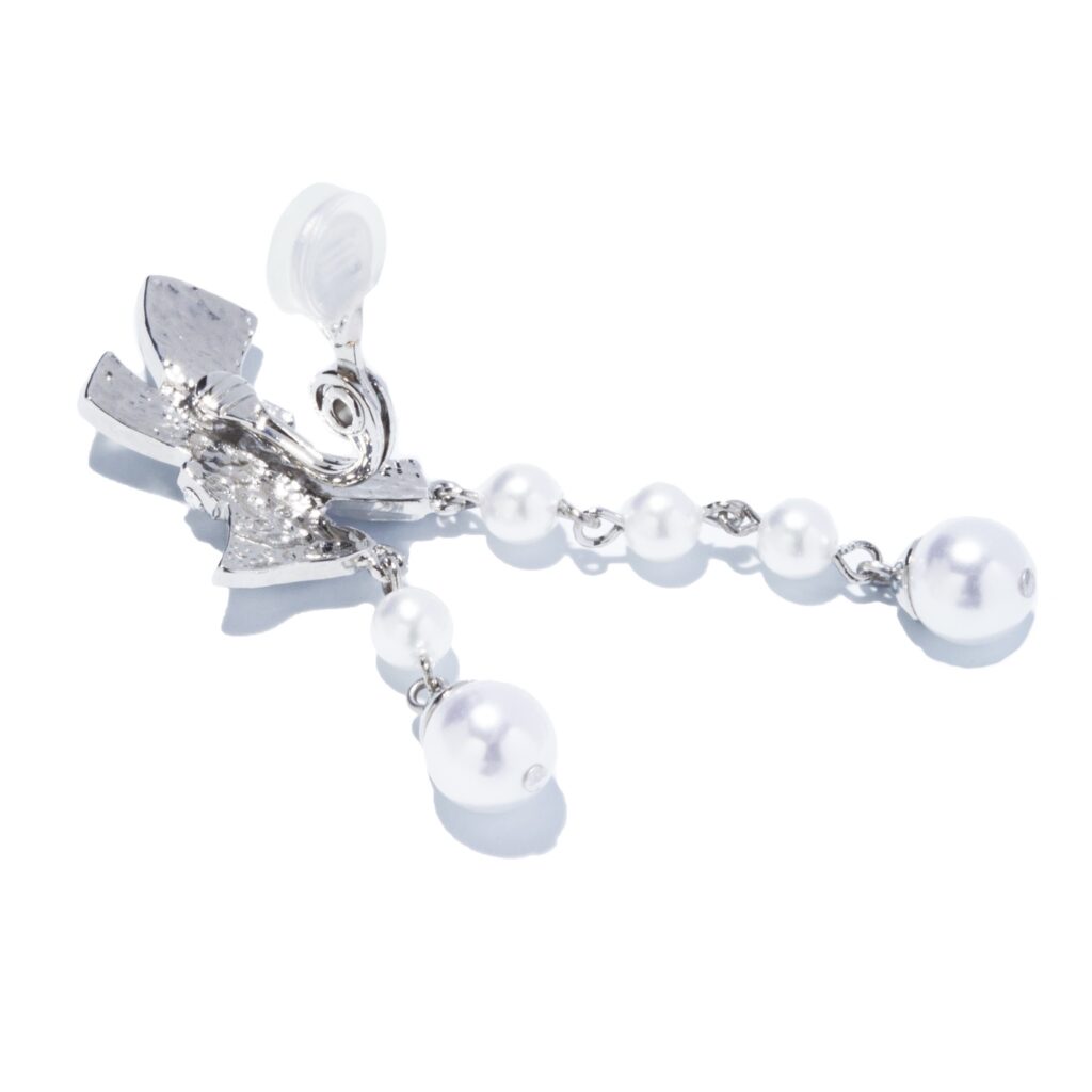 ガラスを敷き詰めたリボンモチーフと、アシンメトリーに繋いだパールが、華やかでモード。縦のラインが強調されたデザインで顔周りがすっきり見えるという嬉しい視覚効果も。ハンサムなオールインワンやジャケットに合わせて取り入れたい大人のリボンピアス。コーティングにはニッケルを使用せず、アレルギー反応の負担を軽減。耳への負担や落ちにくさを考慮したシリコンキャップ付きで、付け心地も◎