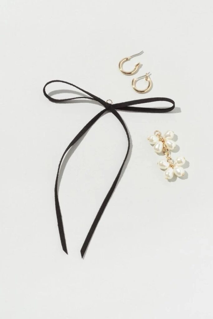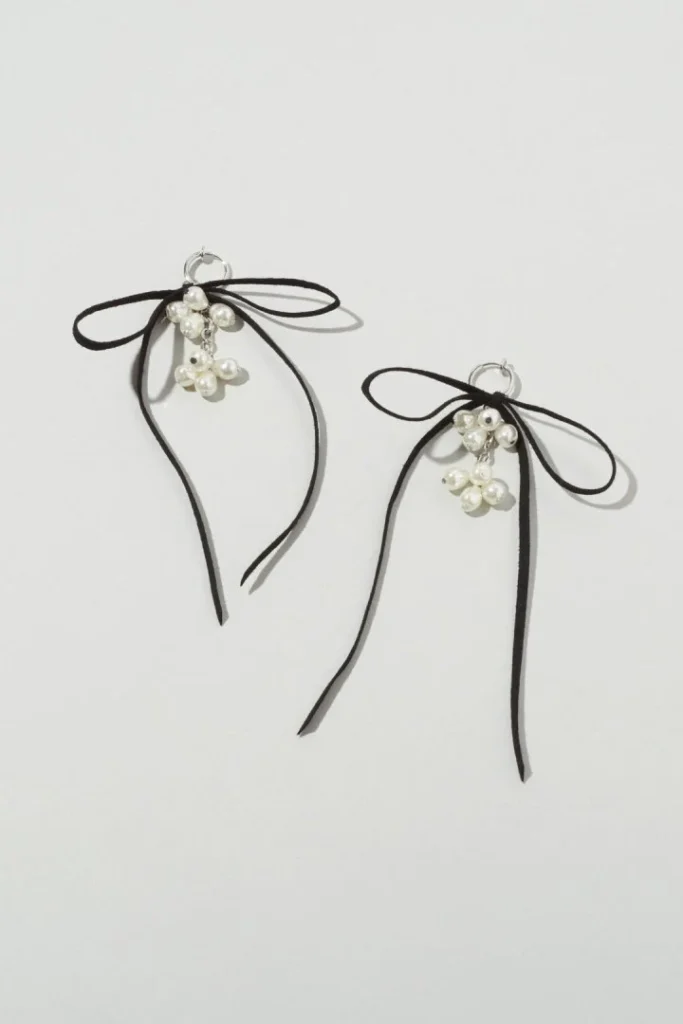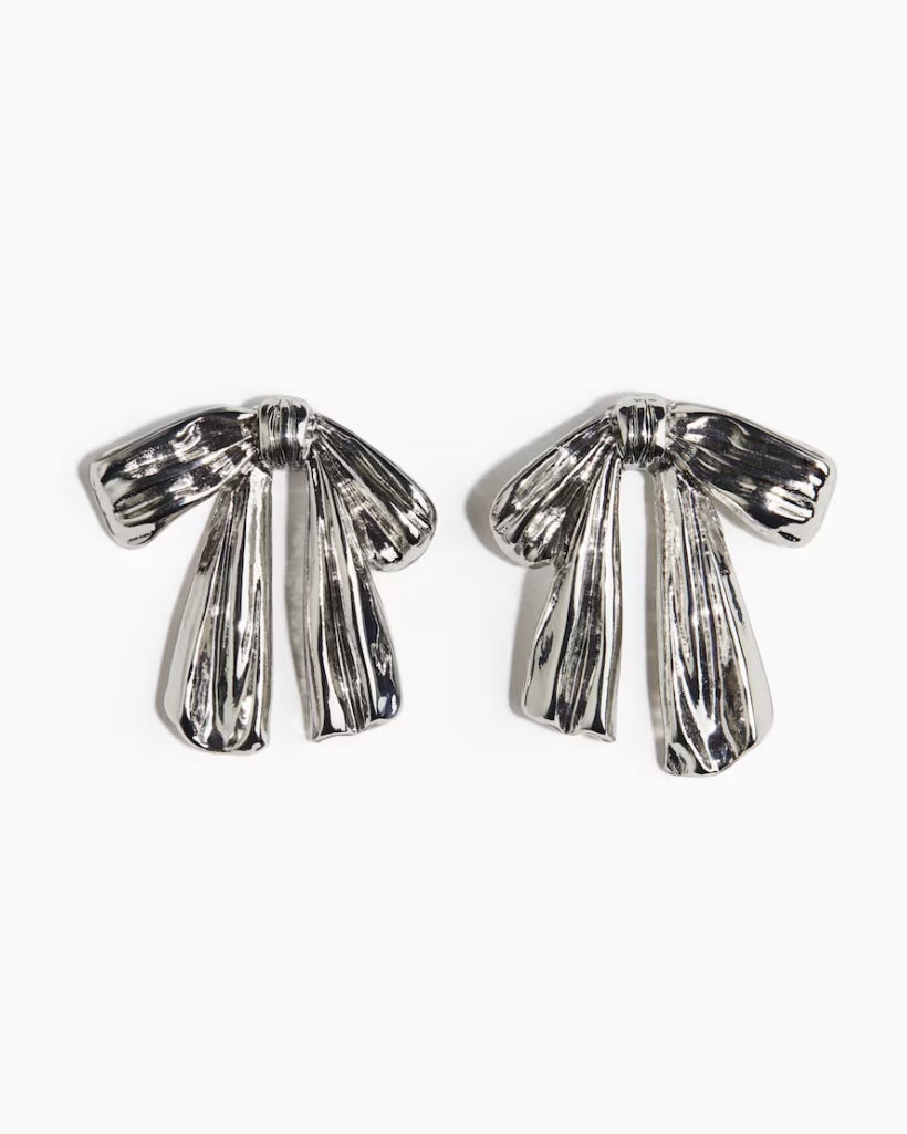 プチプラで気兼ねなく使えるピアスが揃うH&Mでもリボンシェイプのアイテムが登場。リアルなリボンを金属で表現したアイテムで、甘くなりすぎず、モードな印象に。シンプルなコーデとタイトヘアに合わせて披露宴に、少しカジュアルな装いに合わせれば2次会にもぴったり。