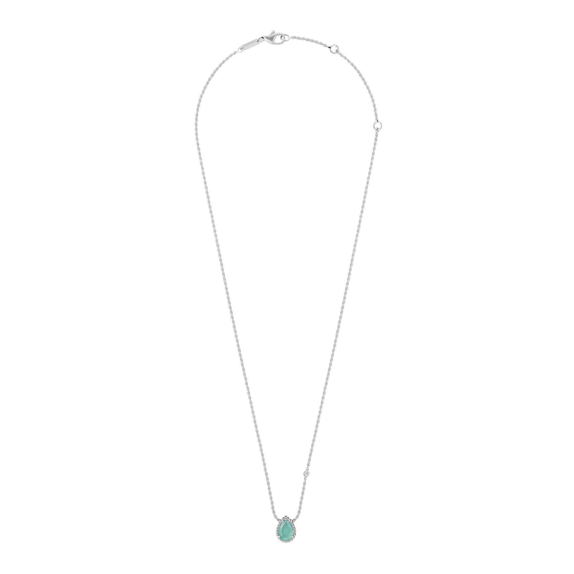 CLASSY.読者の間で、いま注目度急上昇の「セルパンボエム」コレクション。憧れのダイヤモンドはもちろんのこと、最近はカラーストーンのアイテムにも人気が波及。今回ピックアップしたのは、瑞々しいブルーのストーンが目を惹くペンダント。WGのツイストチェーンには、ひと粒ダイヤモンドが煌めき、アクアプレーズのクリーンな印象をより際立てています。
