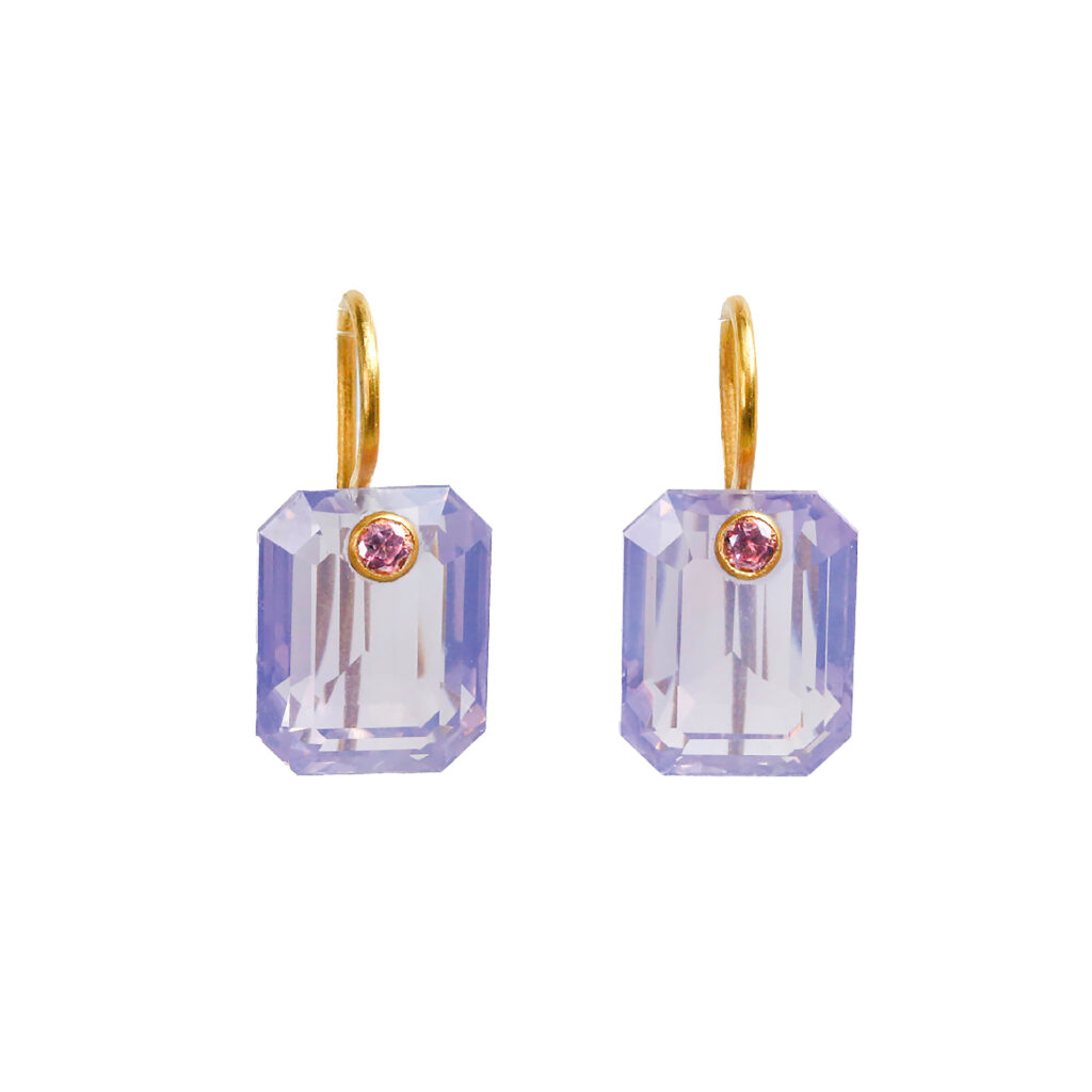 エメラルドカットのラベンダークォーツに小粒のピンクサファイアをセットした、マリーエレーヌ ドゥ タイヤックらしいチャーミングなデザイン。ジェムストーンの美しさを最大限に引き出すために、ゴールドのフックパーツ部分は控えめな存在感。ジェムの輝き・カラー・フォルムを存分に味わえるピアスです。