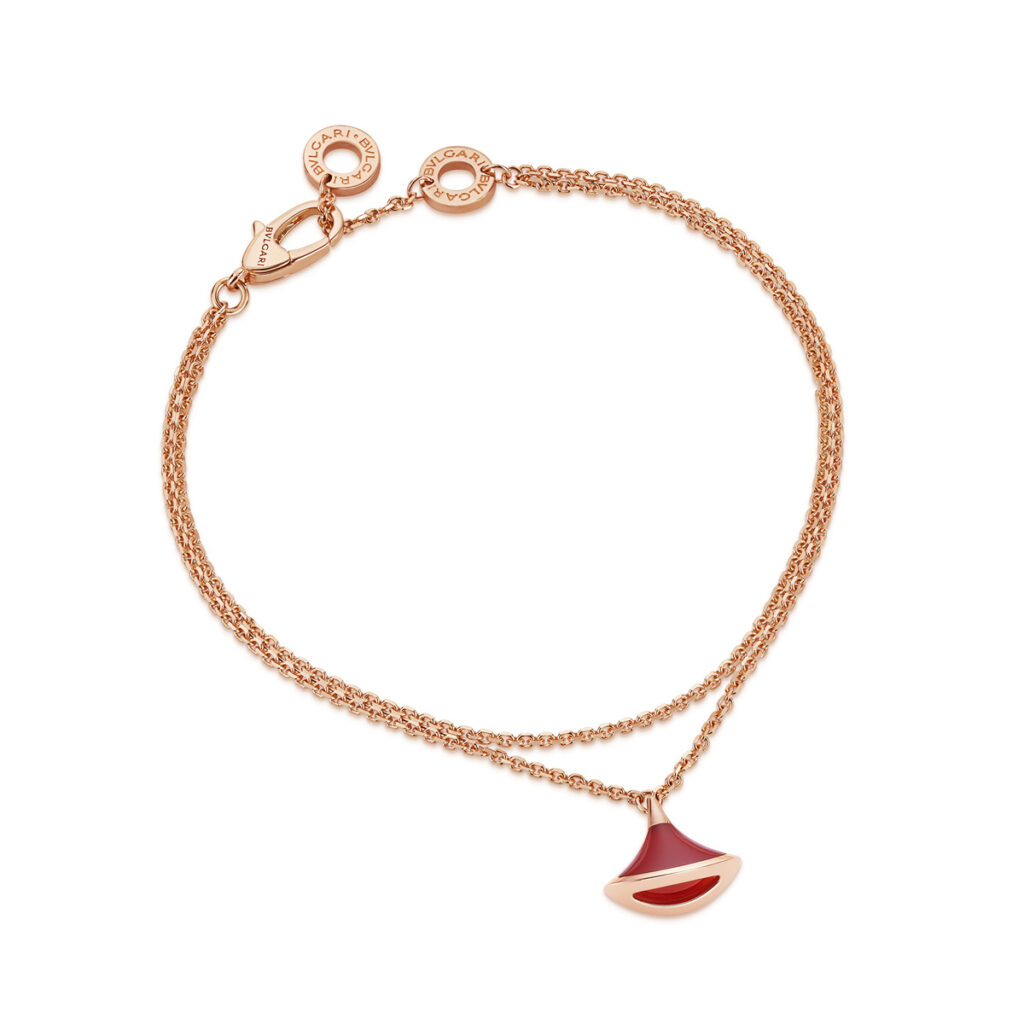 デイリーにもオケージョンにも使える上品なデザインと、手の届きやすい価格帯で、“ファースト ブルガリ”としてもぴったりな「ディーヴァ ドリーム」のブレスレット。ローマ遺跡のカラカラ浴場のモザイクをモチーフにしたコレクションで、扇型のアイコンが特徴です。ゴールドのチェーンとカーネリアンが互いに輝き合い、優美なハーモニーが楽しめます。