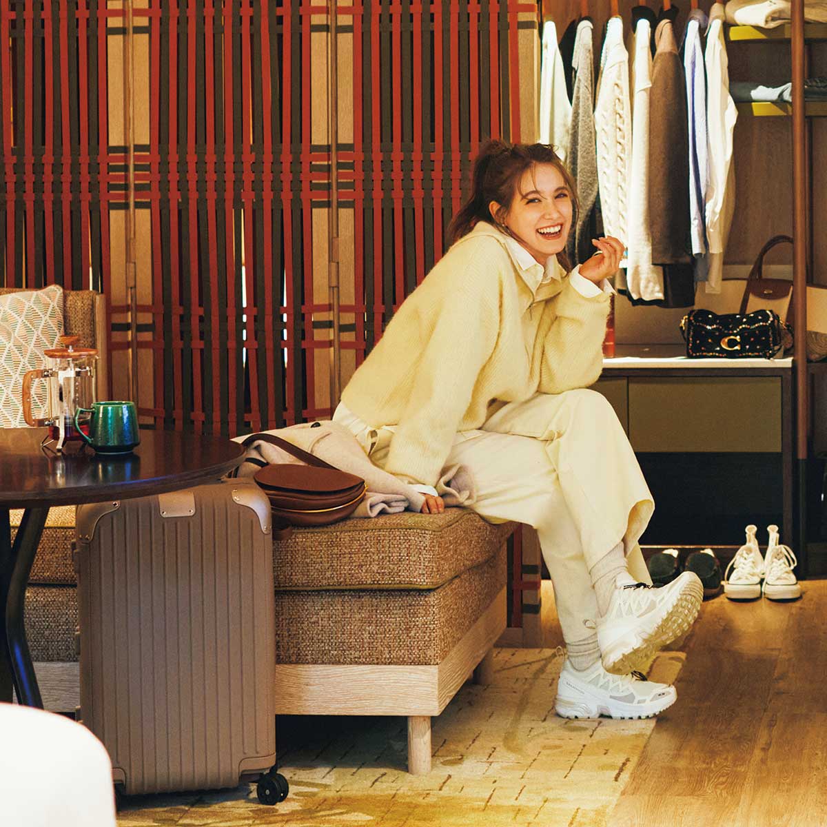 「トランクに詰めてきたワードローブを、ホテルのクローゼットに並べて眺める時間も楽しい!」。本特集の取材で、CLASSY.世代から度々耳にしたこの言葉。いつ、どこで、何を着るか。旅とファッションの関係は密接。あれこれ思いを巡らせて、予定やシーンに合わせて一日数回着替えるのも、旅のお楽しみ。トラちゃんのような多幸感あるペールカラーのワントーンは、冬旅に映える着こなしアイディア。“いつもと違う”に挑戦する。少しだけ非日常のスタイリングは、旅の高揚感をさらに上げてくれる。シャツ¥18,150(emmi /emmi ニュウマン新宿店)ニット¥19,910(FRAY I.D/FRAY I.D ルミネ新宿2店)パンツ¥25,300ジャコット¥35,200(ともにMIESROHE/MIESROHE ルミネ新宿1店)ピアス¥69,300(ヴァンドーム青山/ヴァンドーム青山 プルミエール 伊勢丹新宿店)リング¥19,800(アルティーダ ウード)ショルダーバッグ¥152,900(WANDLER/ブルーベル・ジャパン)キャリーケース¥542,300(リモワ/リモワ クライアントサービス)ソックス¥2,200(マルコモンド)スニーカー¥26,400(サロモン/サロモン コールセンター)