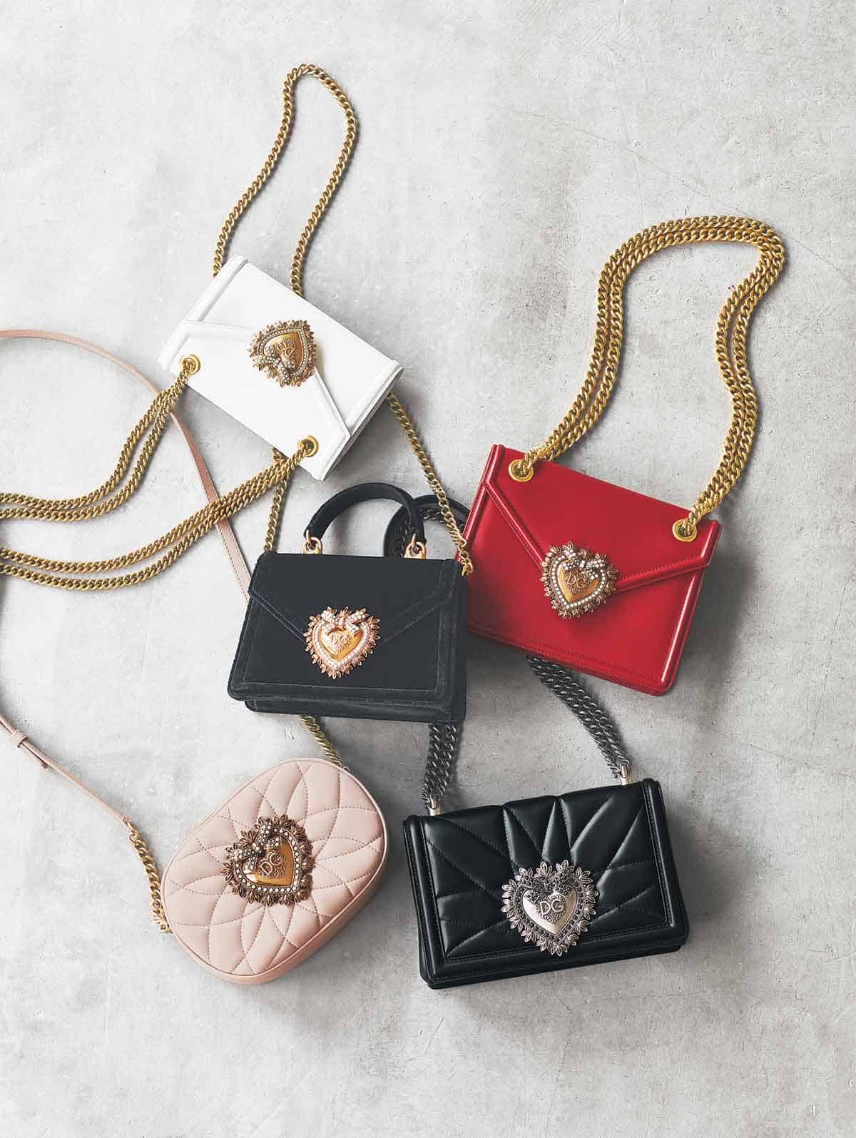 どこかヴィンテージライクなクラシックさと華やかさを併せ持つディヴォーション バッグ。これからの季節は鮮やかな赤やベルベット素材もぴったり。 【上左から時計回りに】バッグ「ディヴォーション バッグ」〈H11.5×W17.5×D3cm〉¥125,000バッグ「ディヴォーション バッグ」〈H15.5×W20.5×D4cm〉¥159,000バッグ「ディヴォーション バッグ」〈H14.5×W21×D3cm〉¥215,000バッグ「ディヴォーション カメラバッグ」〈H13×W18.5×D5cm〉¥138,000バッグ「ディヴォーション バッグ」〈H13×W19×D4.5cm〉¥159,000(すべてドルチェ&ガッバーナ/ドルチェ&ガッバーナ ジャパン)
