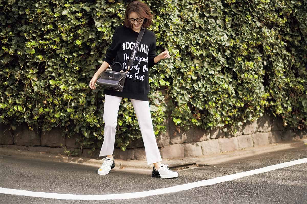 モノトーンスタイルにパンチのあるスニーカーがアクセント。好きなモチーフを選んでペインティングを施すことができるアートなスニーカー。 対象スニーカー¥65,000~(モチーフ1~4個¥6,500、5~10個¥13,000、11~20個¥26,000)バッグ「シシリー ラバー」〈H18×W22×D11cm〉[ショルダーストラップ取り外し可能]¥127,000ニット¥165,000パンツ¥99,000(すべてドルチェ&ガッバーナ/ドルチェ&ガッバーナ ジャパン)メガネ¥33,000(ドルチェ&ガッバーナ/ドルチェ&ガッバーナ アイウェア)