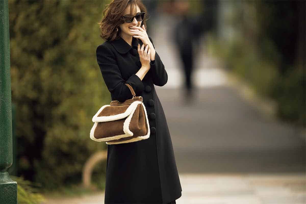 上品でシンプルなフォルムと高い機能性で人気のシシリー ソフトに冬素材が登場。なかでも暖かみのあるムートンは誰からも愛されそう。バッグ「シシリー ソフト」(ミディアム)〈H26×W34×D14cm〉[ショルダーストラップ付き]¥285,000コート[予定価格]¥280,000スカート[予定価格]¥143,000イヤリング¥55,000(すべてドルチェ&ガッバーナ/ドルチェ&ガッバーナ ジャパン)サングラス¥30,000(ドルチェ&ガッバーナ/ドルチェ&ガッバーナ アイウェア)