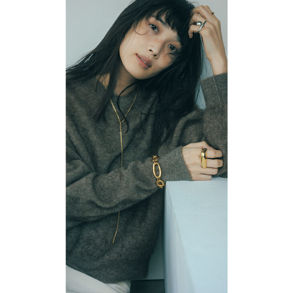左手ダブルフィンガーリング〈SV〉¥63,800〈コールムーン〉右手ダブルフィンガーリング〈SV×YGコーティング〉¥49,500〈アサミフジカワ〉(ともにショールーム セッション)ブレスレット¥35,800(アフェクト/ラッキーアンドカンパニー)ネックレス〈SV×YGコーティング〉¥60,500(ブランイリス/ブランイリス トーキョー)リング¥26,400〈SV×YGコーディング〉(ガガン)ニット¥50,600(カレンソロジー/カレンソロジー 新宿)パンツ¥17,600(ヘルシーデニム/スローブ イエナ 自由が丘店)