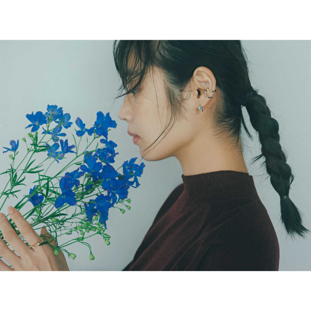 イヤカフ上〈SV×YGコーティング×キュービックジルコニア〉¥30,800(ヴァーミリオン)リング〈YG〉¥22,000(ヴイエー ヴァンドーム青山/ヴイエー ヴァンドーム青山 有楽町マルイ店)イヤカフ下〈SV〉¥7,700(ジュエッテ)ニット¥23,100(HER.)