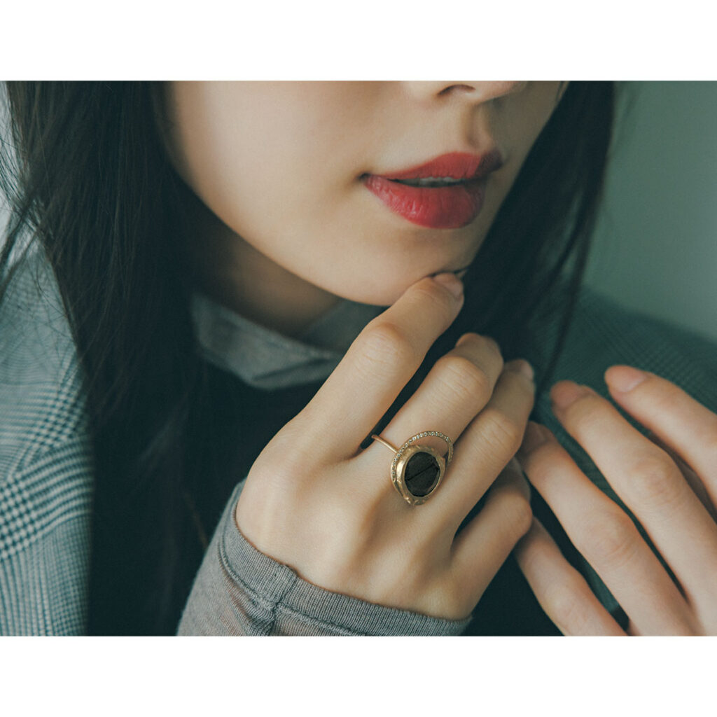 ピアス¥25,300ブローチ¥17,600(ともにアデルビジュー/アデルビジュー ショールーム)ネックレス〈SV×YGコーティング〉¥126,500(ソフィーブハイ/エスケーパーズ アナザーワールド)リング〈YG×D×ラブラドライト〉¥209,000(パスカルモンヴォワザン/ショールーム セッション)レイヤードタートルネックニット¥28,600(サードマガジン)ジャケット¥44,000(プランクプロジェクト/プランクプロジェクト 青山店)