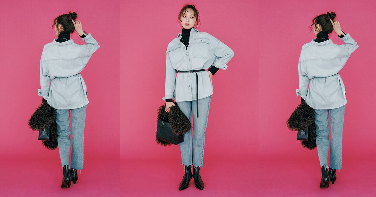 上下デニム以外は、黒で引き締めて懐かしムードを回避。タートル¥10,780(カデュネ プレスルーム)デニムシャツ¥20,900(ヘルシーデニム╱ゲストリスト)デニムパンツ¥9,460(ミラ オーウェン╱Mila Owen ルミネ新宿2店)ベルト¥9,900(アンタイトル)バッグ¥93,500(メゾン カナウ╱ヤマニ)ブーツ¥25,990ファーストール¥5,290(ともにザラ╱ザラ カスタマーサービス)ピアス¥40,700ネックレス¥41,800(ともにマリハ)