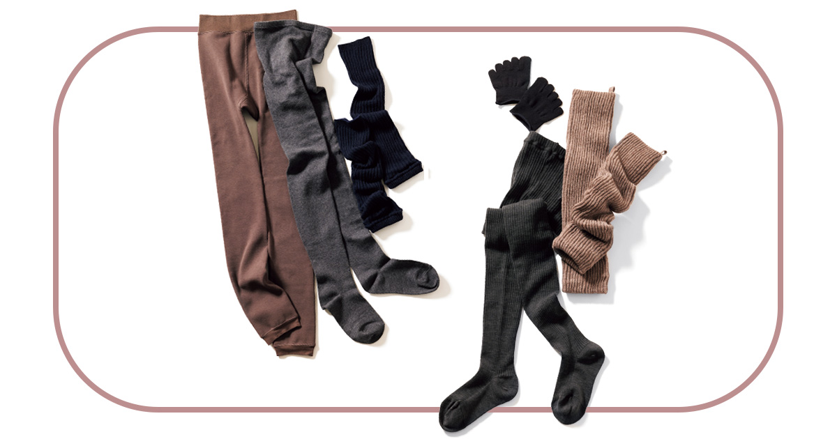 〔右上から時計回りに〕ふんわり素材で締め付け感ゼロ。レッグウォーマー¥2,200暖かな光電子素材とズレにくいかかとの縫製で快適。タイツ¥4,400つま先の冷えを防ぐハーフタイプをタイツの中に仕込んで。ソックス¥880(すべてタビオレッグラボ/タビオ)