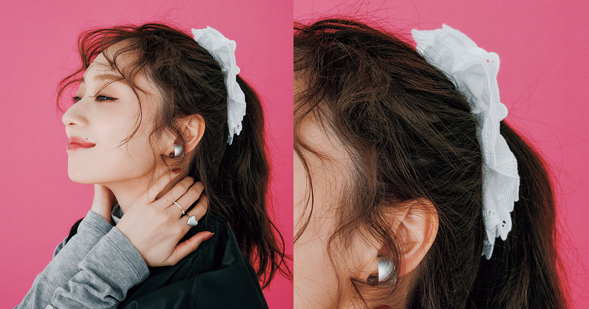 シュシュ¥3,740(CRANK╱HANA SHOWROOM)タートル¥13,200(アンクレイヴ╱オンワード樫山)ベスト¥39,600(アッパーハイツ╱ゲストリスト)ピアス¥211,200パールリング¥42,900ハートリング¥35,200(すべてマリハ)イヤカフ¥16,500(アナプノエ╱フォーティーン ショールーム)バングル¥26,400(フィリップオーディベール╱アンタイトル)