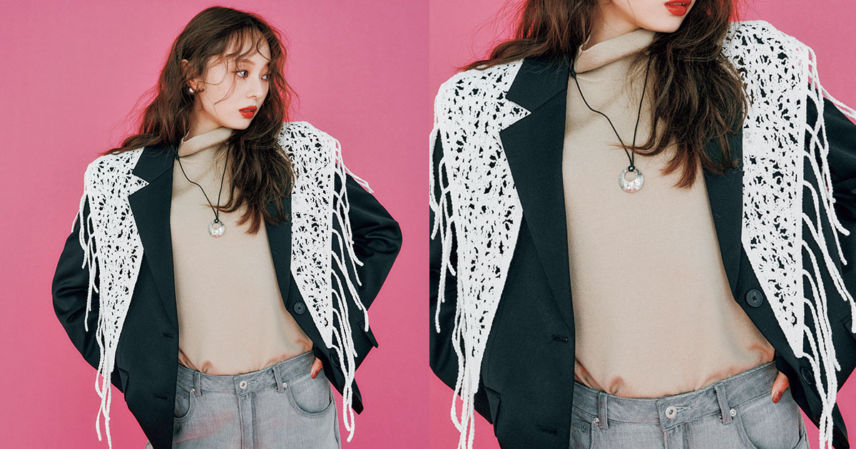 三角ストール¥10,627(MILLO WOMEN╱HANA SHOWROOM)タートル¥16,000(バナナ・リパブリック)ジャケット¥27,720デニムパンツ¥17,270(ともにINSILENCE╱HANA KOREA)ピアス¥27,500(アナプノエ╱フォーティーン ショールーム)ネックレス¥22,000(アダワットトゥアレグ╱The Edit Store)