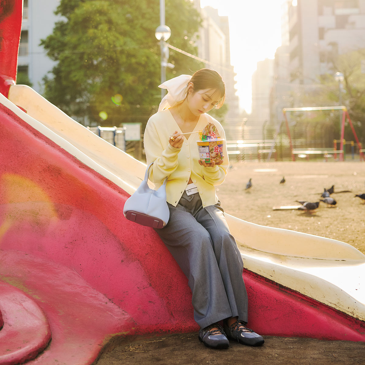 淡いイエローのVネックカーデを一枚で着こなし、ヘルシーなムードを楽しむのも◎。ビッグシュシュで遊び心を添えても、端正なグレーパンツのおかげで派手に転ばず大人らしくまとまります。潔いワンツーコーデでも色の組み合わせで洒落感が出て、季節の気分に寄り添う装いに。