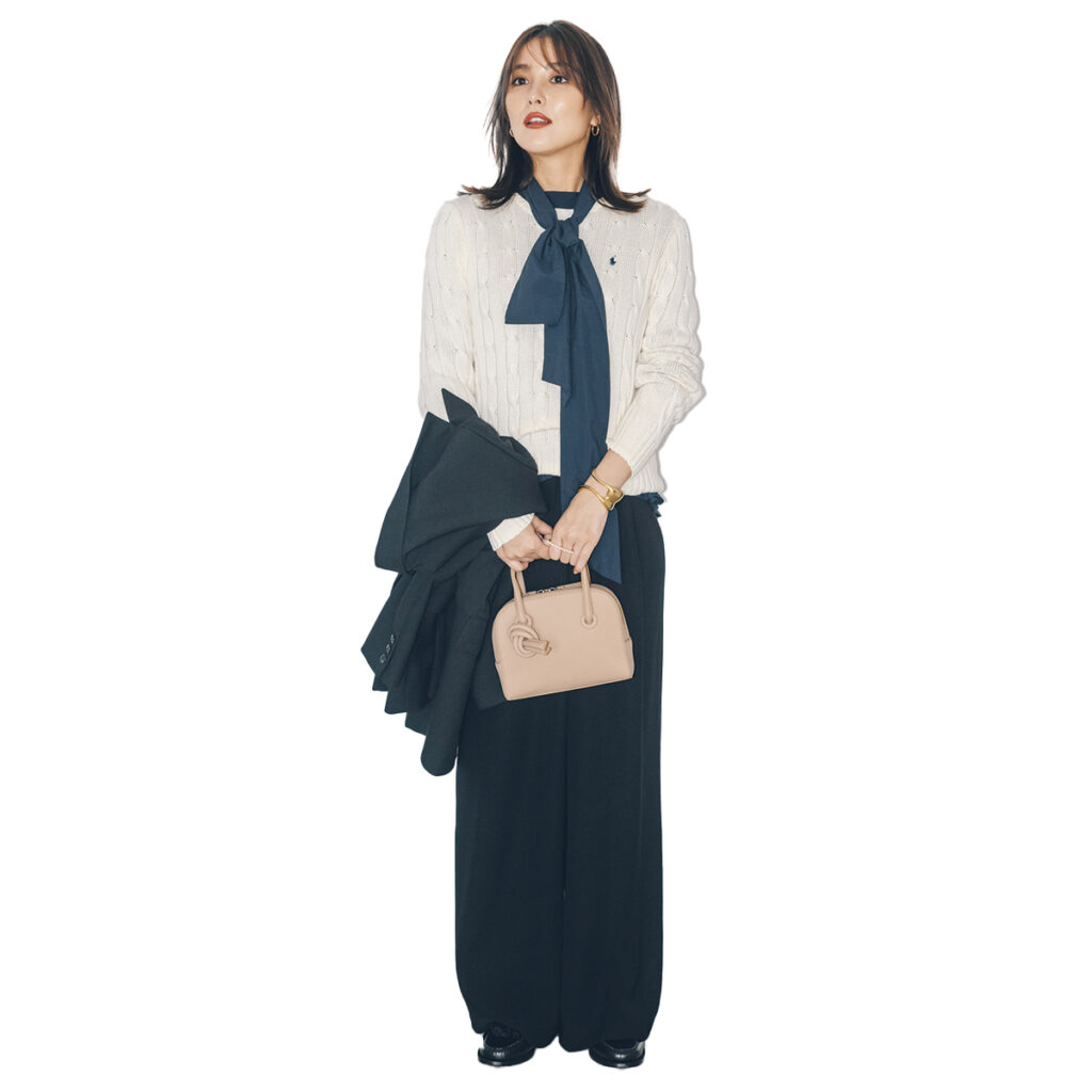 白のリブカーデは、縦ラインが強調されてすっきり見えが叶ううえ、顔まわりを明るく見せてくれるのがうれしいポイント。ボウタイを外に出して重ねると、アクセサリーに頼らなくても華やぎが添えられ、クラシカルな雰囲気が自然と引き立ちます。ワイドパンツでほんのり力を抜けば、上品さをキープしながら親しみやすさも感じる装いが完成。