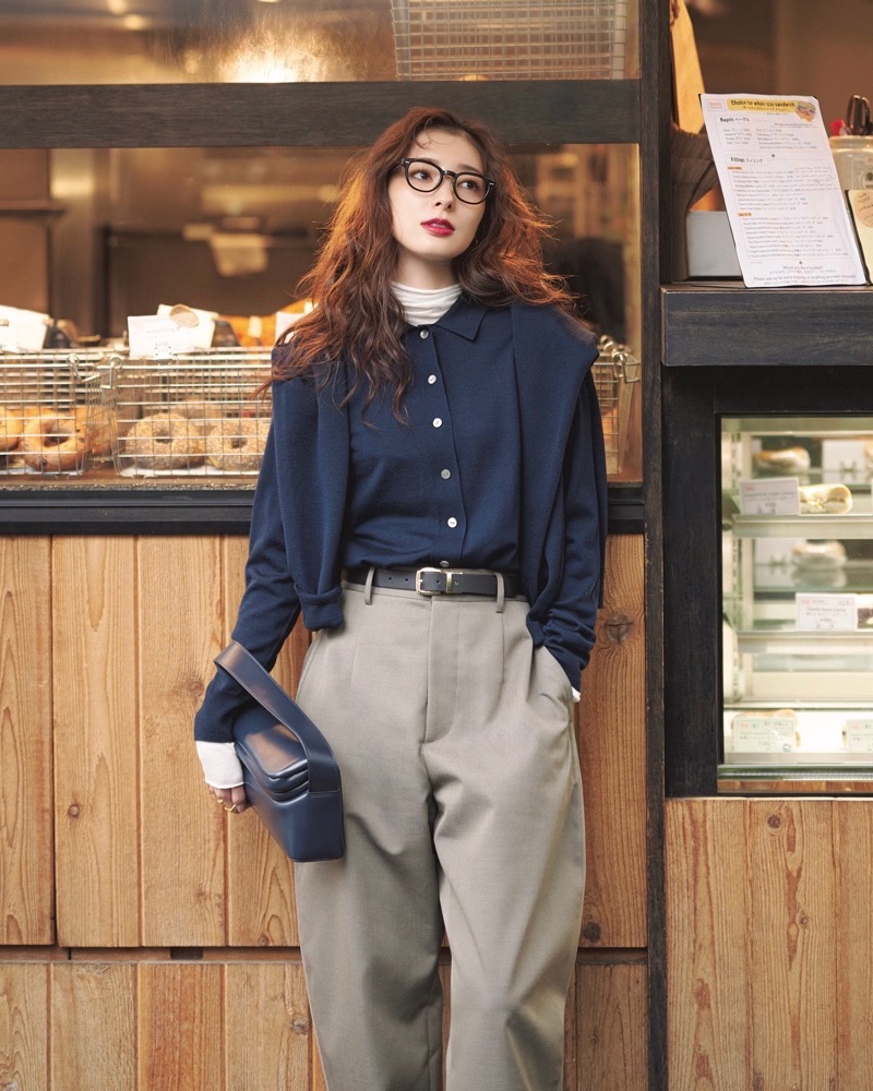 形違いの同素材カーデを重ねてネイビーの奥行きを引き出した、大人のアンサンブル風スタイル。ニットをさらりと肩掛けするだけで、単調になりがちなワントーンが見違える印象に。衿元の白タートルが軽さを添え、やわらかなトーンのパンツを合わせれば、全体がすっきりと都会的にまとまります。