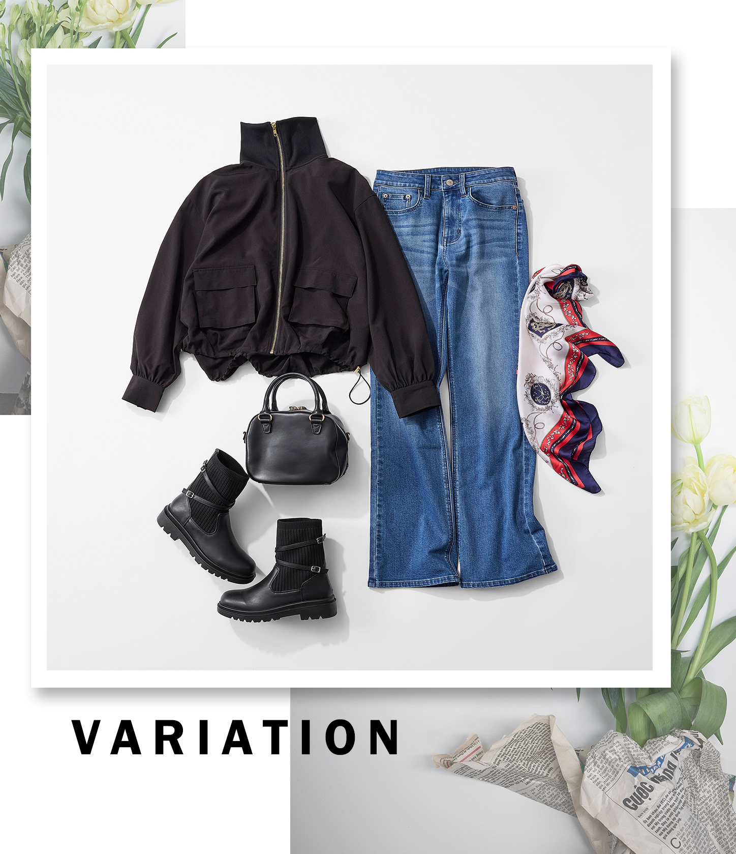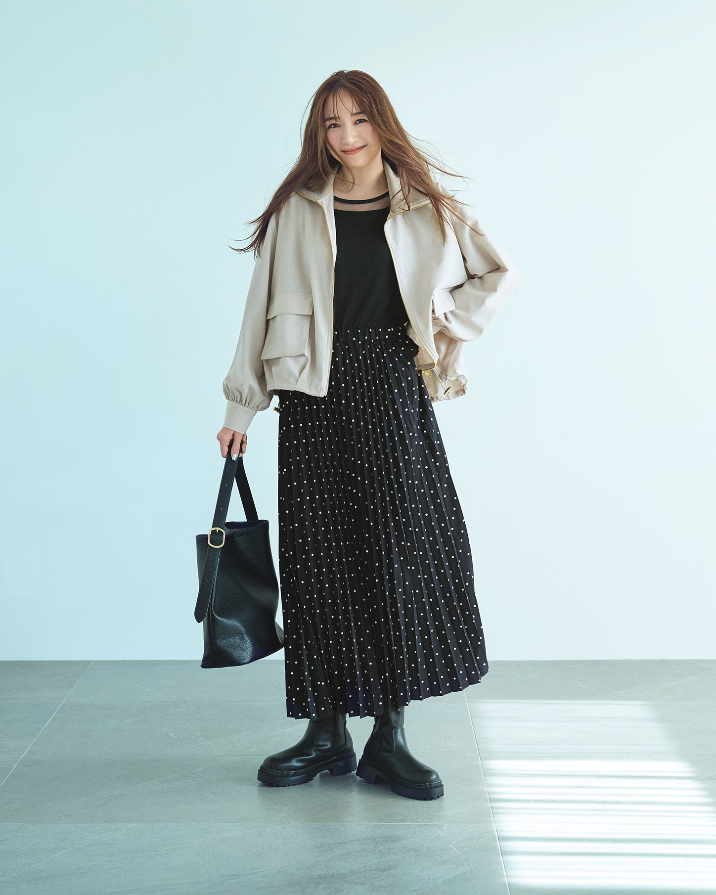 高いリブ衿やマチつきのフラップポケットなど旬のディテールを盛り込んだジャケットは、ゴールドファスナーがリッチな印象。スカート軸のフェミニンなワードローブに投入すれば、こなれたムードも今っぽさも叶えてくれます。