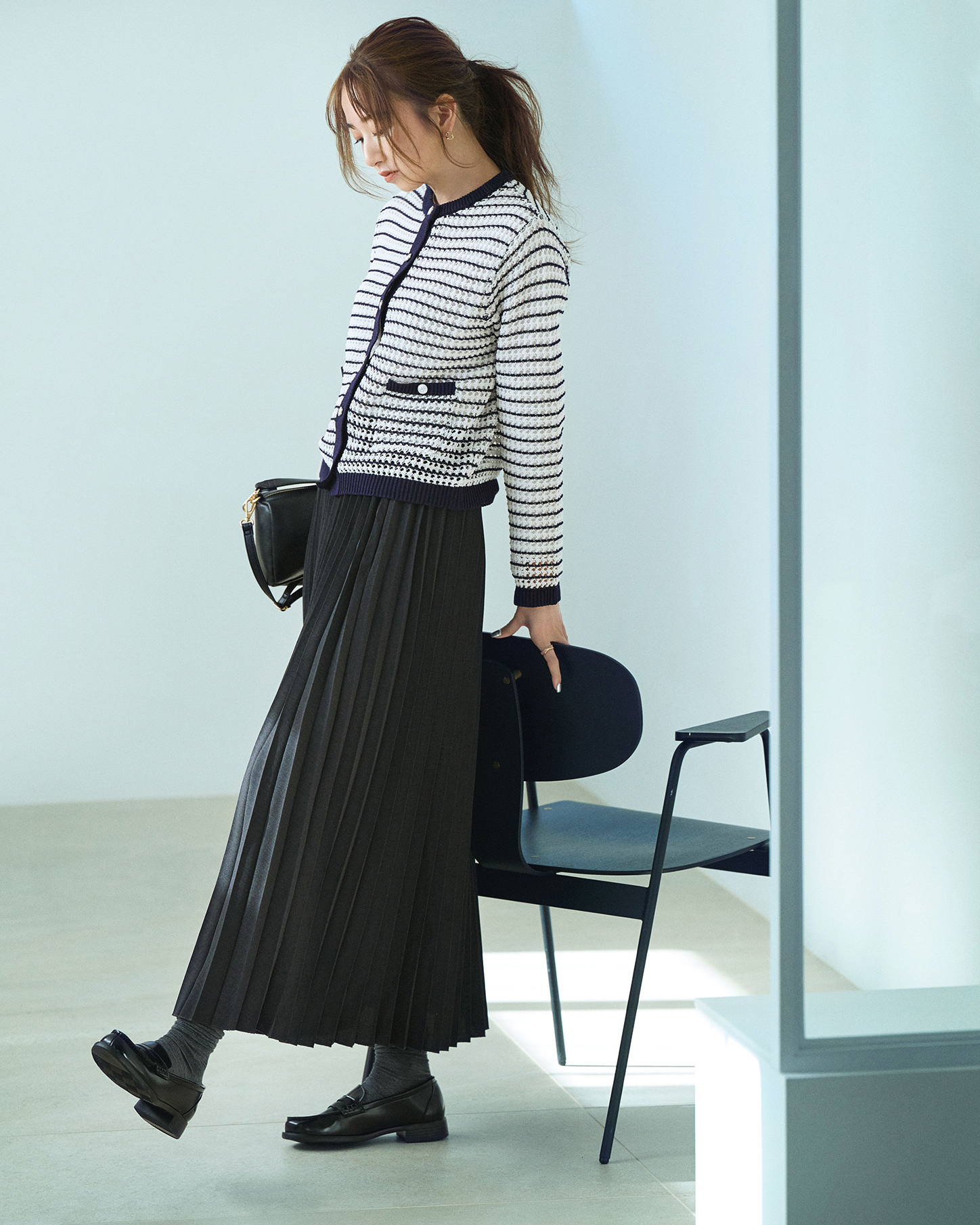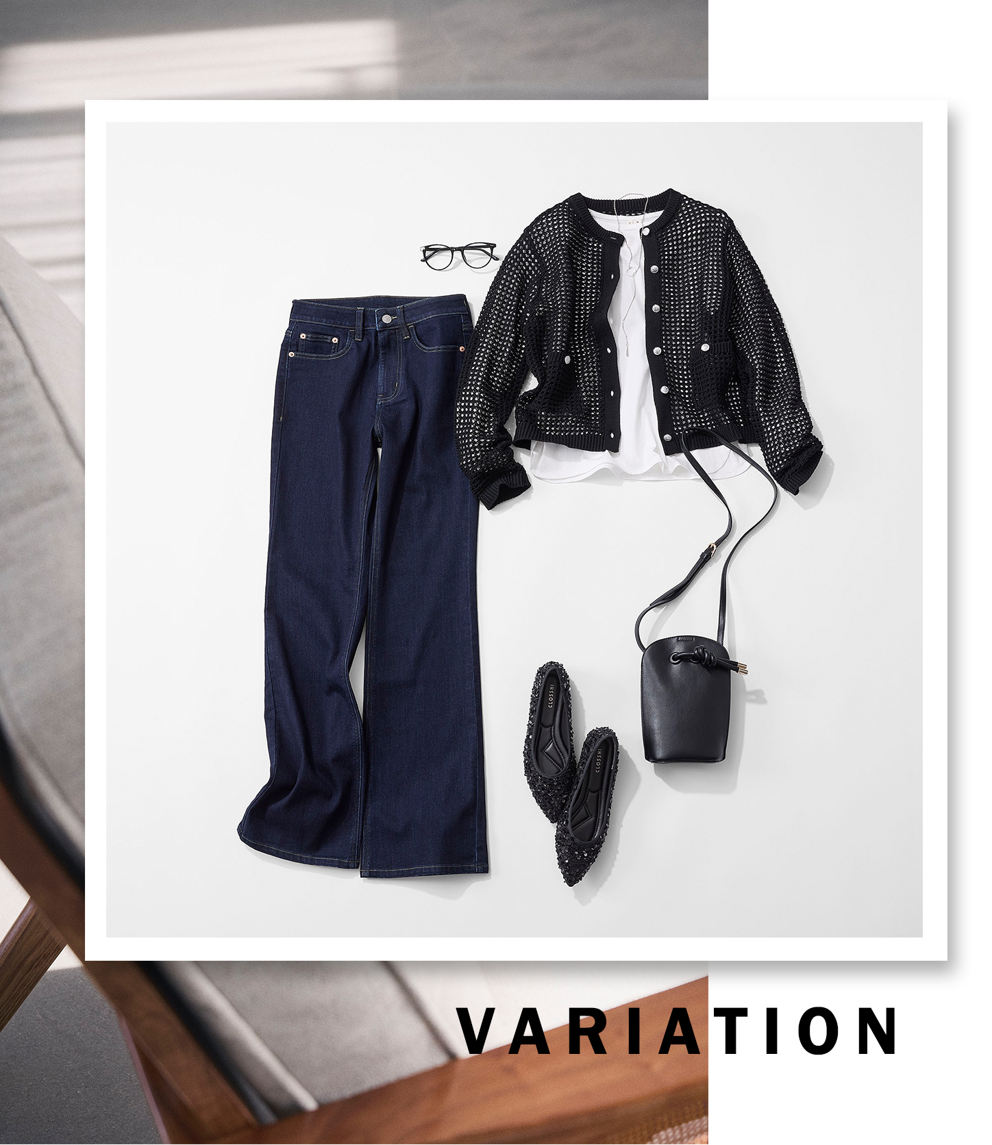 トップスの黒にデニムのインディゴが上品なムードを漂わせる知的カジュアルなスタイリング。ニットカーディガンはシルバーのメタルボタン効果でジャケット見えするリッチ感。透かし編みからのぞく白で添える抜け感もポイントです。