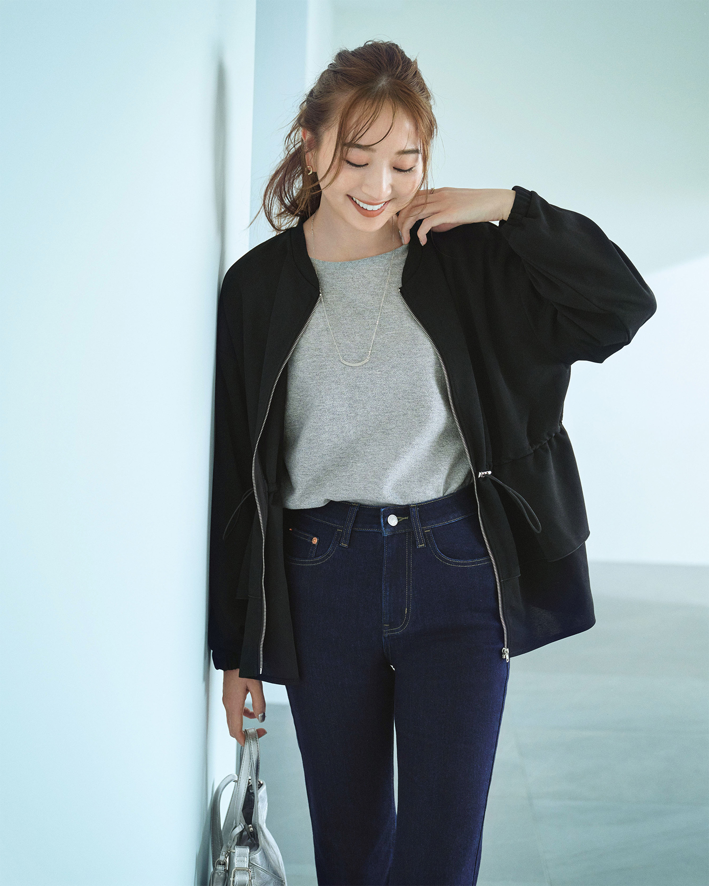 フロントファスナーを上まで閉めて裾のドローコードをキュッと絞れば、シルエットも印象もガラリと変化。ブルーデニムとハードな足元、そしてスカーフをひらりとあしらって、ヴィンテージ気分のモードカジュアルを楽しみたい。