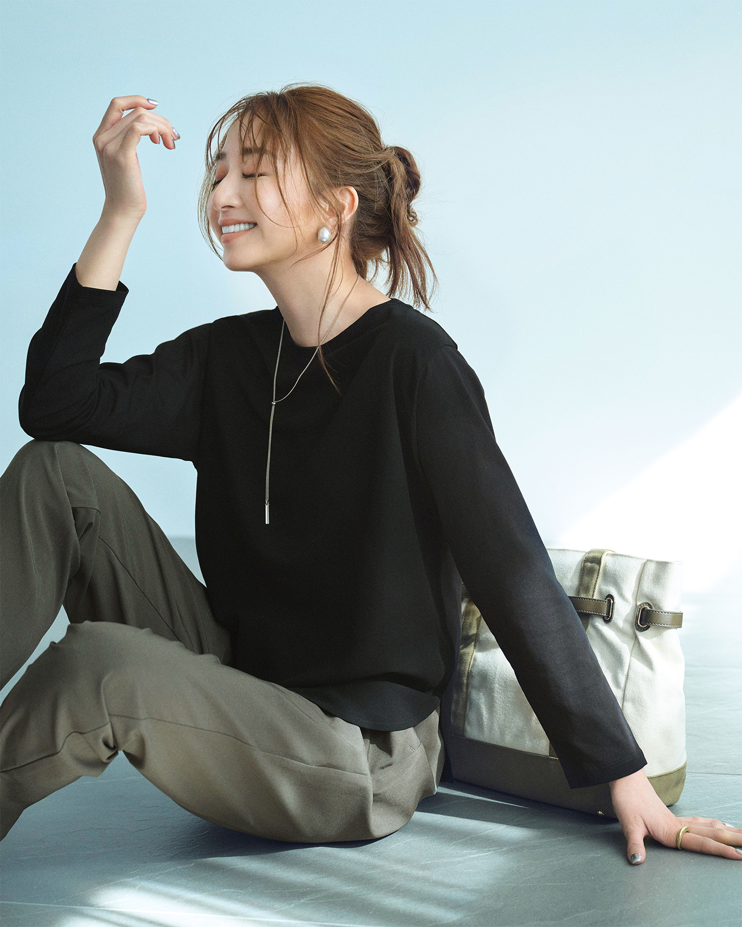 ネックレス付きカットソー¥1,089パンツ[ベルト付き]¥2,420(ともにHK WORKS LONDON)バッグ、ピアス/ともに参考商品