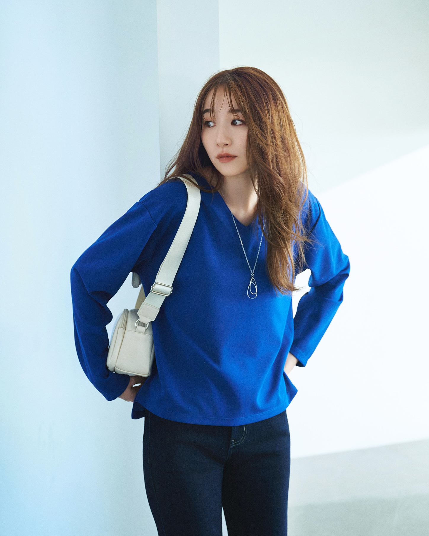 鮮やかなブルーが目を引くVネックトップス。裾のスリットと前後差のある着丈、そして程よくゆとりをもたせたシルエットが大人っぽさの決め手。フレアシルエットのデニムを合わせれば女性らしいカジュアルが楽々完成!