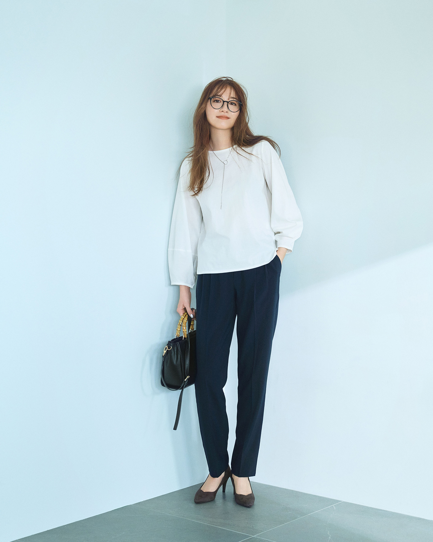 モノトーンでまとめた王道のパンツコーデもランタンスリーブのカットソーでほんのり上品な大人っぽさ。顔周りにクールな華やぎを添えてくれるシルバーカラーのネックレス付きです。きちんと感が求められるお仕事シーンにも大活躍!