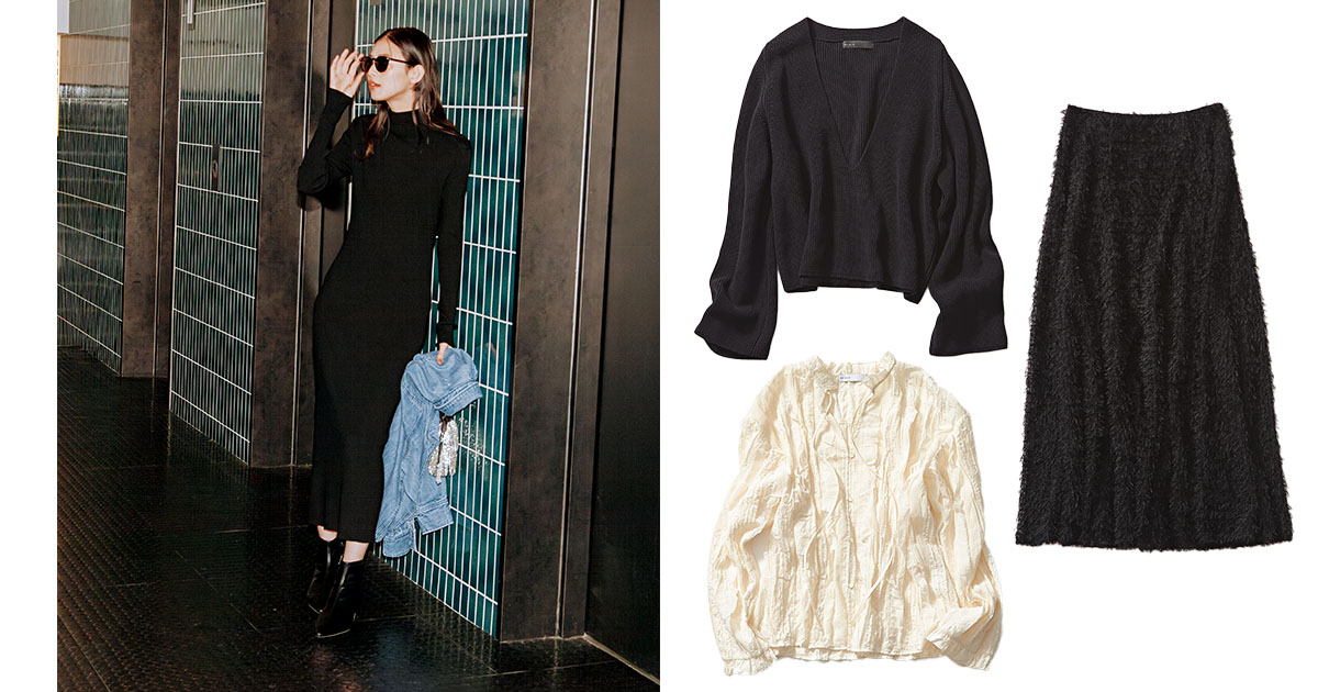 盛れる黒が見つかると定評。シンプルなワンピースでも退屈しないのは、体をキレイに見せるシルエットの美しさが計算されているから。ワンピース¥22,000(ノーブル/ノーブル 有楽町マルイ店)手に持ったGジャン¥35,200(アッパーハイツ/ゲストリスト)バッグ¥50,600(Mintsa/ピモンテ)靴¥13,000(プラステ)サングラス¥50,600(アイヴァン/アイヴァン 東京ギャラリー)イヤカフ¥280,500(ヒロタカ/ヒロタカ 表参道ヒルズ)