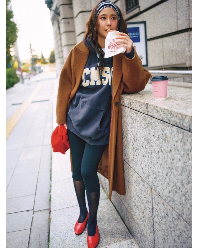 フーディ¥15,400(プレラブド/シンゾーン表参道本店)コート¥58,300(ジャーナル スタンダード レサージュ/ジャーナルスタンダード レサージュ 銀座店)レギンス¥24,200(ザ・ニューハウス/アーク インク)バッグ¥59,400(カルス/アマン)靴¥82,500(マルティニアーノ/サロン アダム エ ロペ)ヘアバンド¥8,800(ラ メゾン ド リリス/ジャーナル スタンダード レサージュ 銀座店)イヤリング¥29,700(セシル エ ジャンヌ/セシル エ ジャンヌ 青山店)リング¥12,650(ミュゼアール/HANA KOREA)サングラス¥28,600(ロンハーマン)中に着たカットソー、タイツ/スタイリスト私物