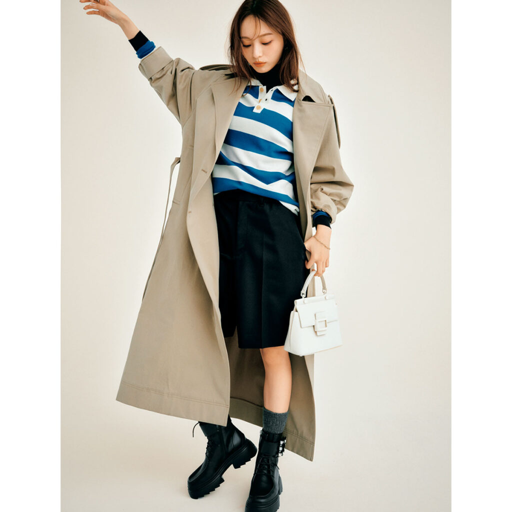 スポーティなラガーニットにロングトレンチをさらりと羽織ることで、大人のムードにシフト。ブルーのストライプが軽さを添えつつ、黒タートルをのぞかせることで端境期でも無理なく取り入れられます。ショートパンツ×重めブーツの組み合わせもトレンチがまとめ役になり、パリの街角を思わせるような洗練されたスタイルに着地。