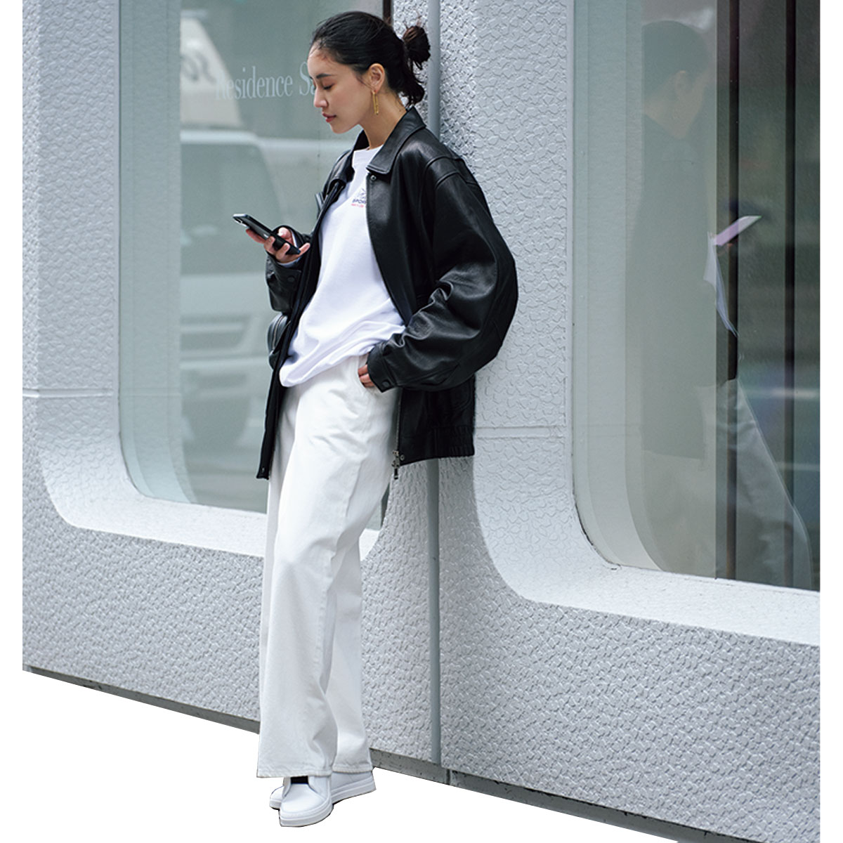 レザーブルゾンの重厚感はオールホワイトで和らげて