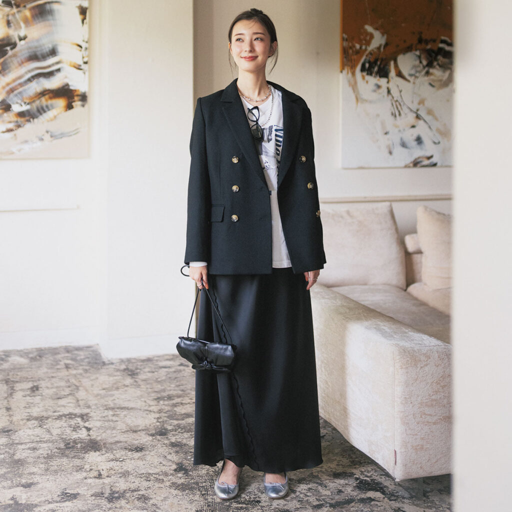 アウターの新定番として浮上したジャコットは、Tシャツ合わせでもきちんと見えが叶う頼れる存在。黒のロングスカートをつなげることで、甘さを控えた大人のモノトーンが出来上がります。シルバーバレエが輝きを足し、オシャレ感度の高さをさりげなくアピール。
