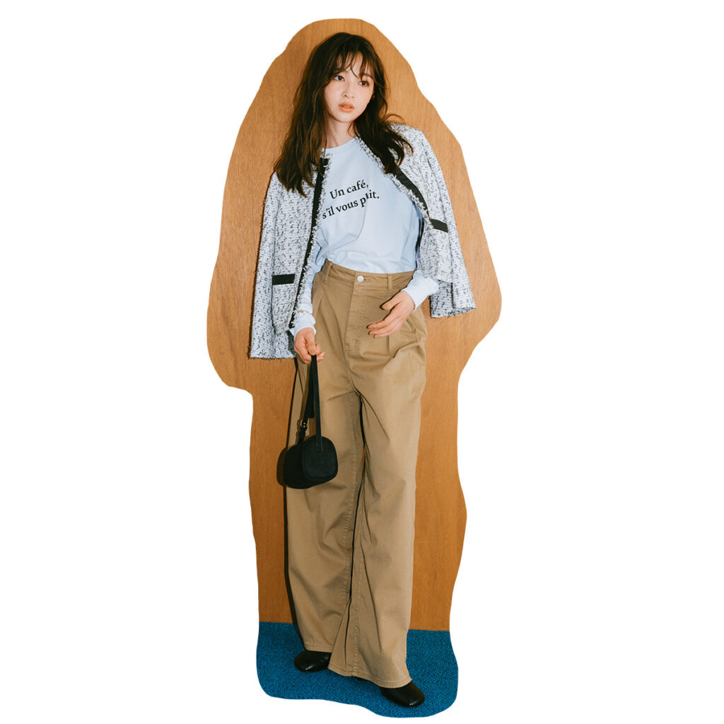 ツイードジャケットのキレイめな雰囲気にロゴTを合わせて、親しみやすい抜けをひとさじ。ワイドチノが全体をリラックス方向へ寄せて、肩の力が抜けたムードにまとまります。黒小物で引き締めれば、上品さを残しつつ日常にちょうどいいジャケットスタイルに。